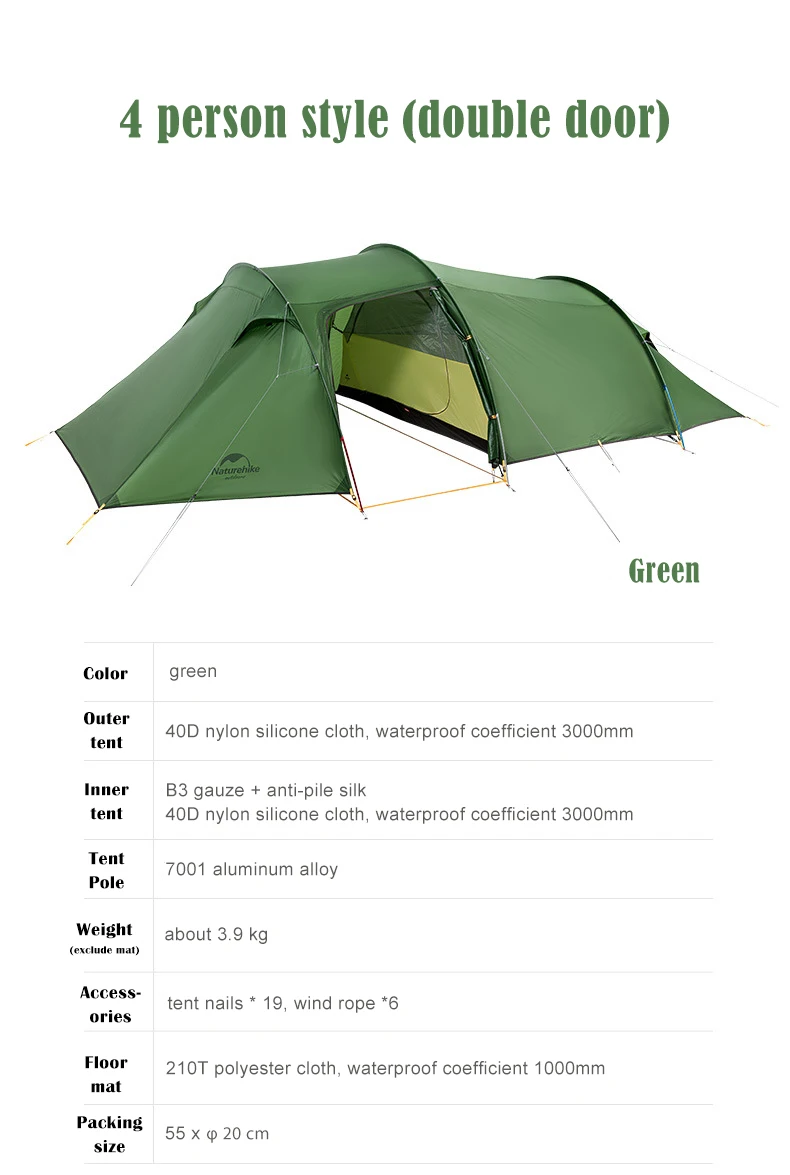 Товар: NH19L004-B (4 мужчины)Цвет: зеленыйМатериал:Палатка муха: 40D нейлон покрытием силиконДно палатки: 40D нейлон с покрытием силиконВнутренняя палатка: B3 высокоточная дышащая сетка из полиэфирного волокнаВодонепроницаемый индекс: 40D PU3000mm +Материал палаточного столба: 7001 алюминиевый сплавРазмер упаковки: около 55xφ20 смВес: около 3,9 КГ без коврикаПодходит для: 4 человекАксессуары: колышки для палатки * 19, ветровая веревка * 6, коврик для палатки * 1Применяется для: на открытом воздухе, кемпинга, пикника, путешествий, альпинизма, и т. Д.