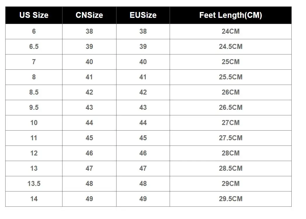 Примечание: Пожалуйста, выберите свой размер в соответствии с длиной Вашей стопы, не выбирайте размер в соответствии с обычным размером вашей страны. Американский/китайский размер не является реальным размером США/CN, это просто переход от размера CN по нашим Правилам.