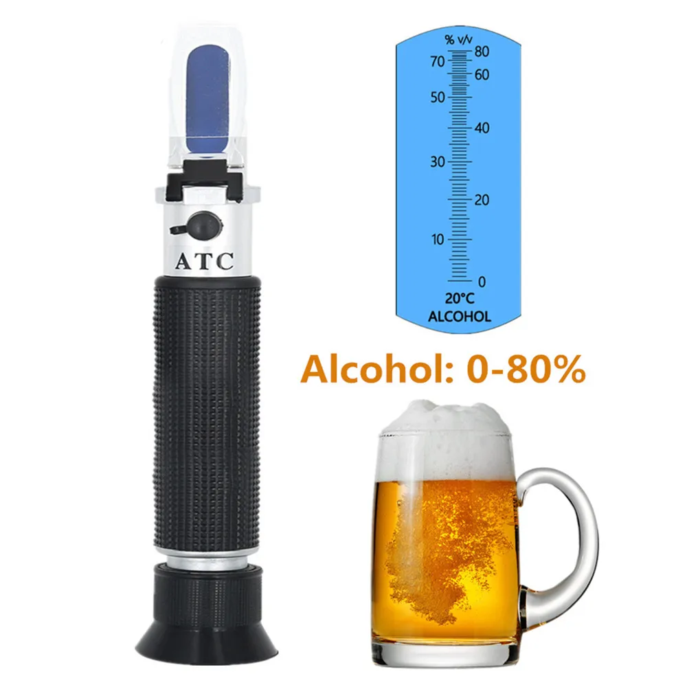 Алкоголь 0-80% рефрактометр ручной ATC метр рефрактометр детектор монитор ликера вино спирт метр скидка 32%Эта модель работает для тестирования алкоголя (для проверки концентрации алкоголя в спиртовом растворе, а не виноградных вин или других фруктовых вин). Единица измерения: W/W (вес/вес), Рекомендуемая рабочая температура рефрактометров при 20 °C (около 18 °C до 25 °C).