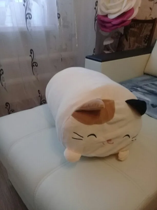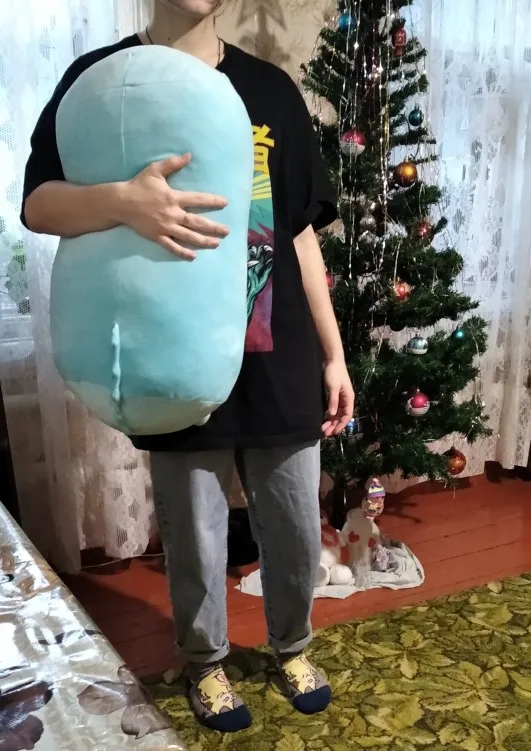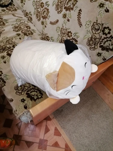 Очень мягкая и приятная игрушка. 90 см это если хвостик натянуть. А так, примерно 80 честных будет точно. Есть молния маленькая, можно ещё добавить синтипона. Но, думаю, это будет лишним. После распаковки немного помятый, но через пару дней выпрямился.