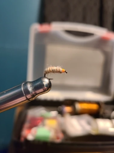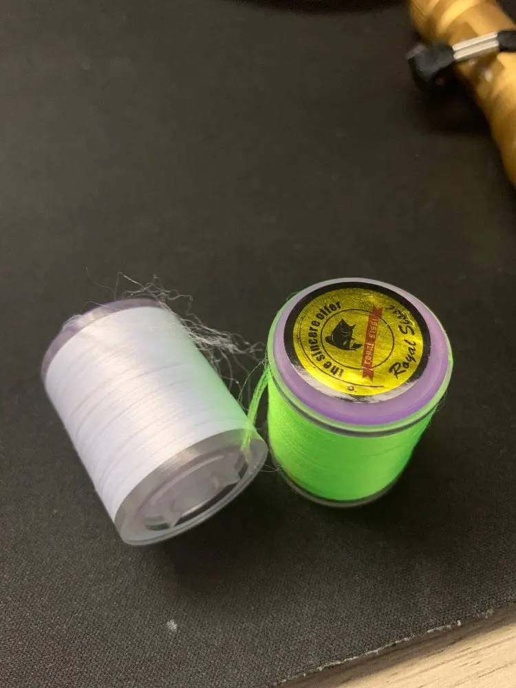 As you can tell from my picture, that's the light reflecting back at me with a uv flashlight, so the claim to be UV Thread is 100% Accurate. Having a UV hotspot gives me even more confidence in my flies, and at the very least it should fish well during the sunset/sunrise. I love that it comes with 250 yards, and is on a perfect sized spool for a bobbin. I do have a couple negatives about the thread. I wish it didn't fray so much, it can easily fall apart. The only benefit to that is it makes random thread hairs come off and shoot everywhere, giving it a more buggy look, a great thing with certain flies if you can control it. The second complaint goes hand in hand with the first problem, because it falls apart so easily if you put to much pressure while tying it can break on you. Overall I really like this thread and it could be alot worse. Plus having a Bright UV Hotspot is just to good of an idea to pass up, and I can't wait to see how the fish react.