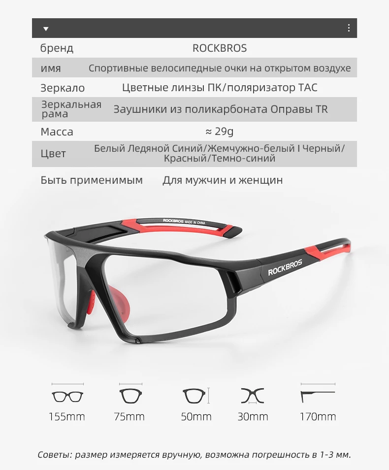 Удивлен качеством сборки и качеством Цена с доставкой из Испании за 48 часов по экспресс-почте. Фотохромная линза прозрачна и неактивирована, поэтому ее можно использовать в условиях слабого освещения и активировать, она действительна для облачных условий времени, но не для интенсивного солнца. The Fit To The Face Is Good And You Can Mold The nose Bridge To Fit any nose shape. Он поставляется с жесткой коробкой, которая имитирует дизайн очень практичного углеродного волокна в дополнение к другой тканевой крышке и салфетке для чистки. Я думаю, что это рекомендуемый продукт и бренд Rockbros, чтобы принять во внимание для будущих покупок.