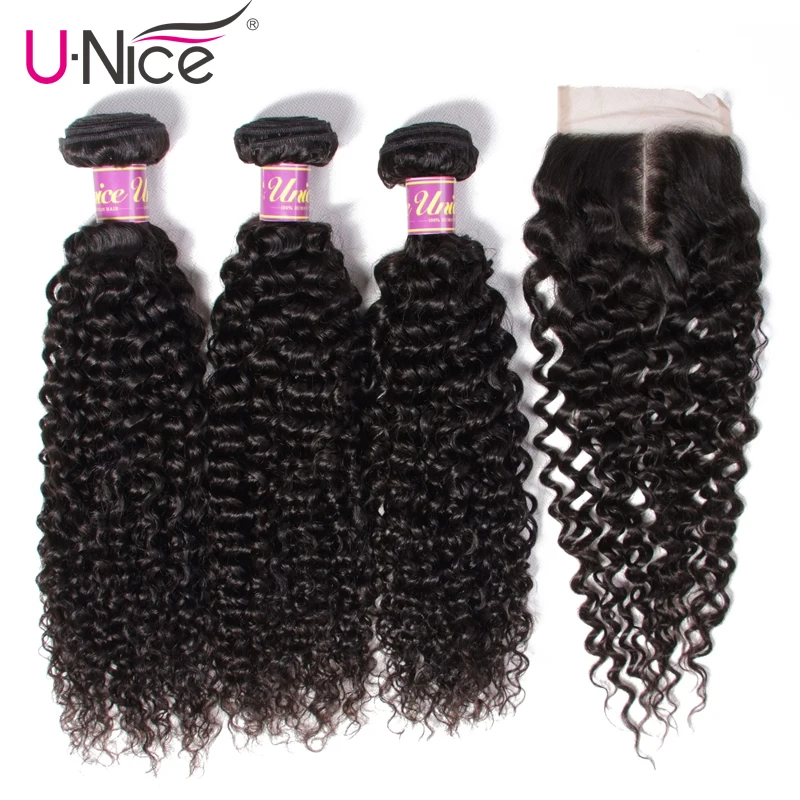 Волосы Unice индийские вьющиеся волосы на кружевной основе, 100% человеческие волосы, 3 пряди с застежкой, натуральный цвет, волосы Remy, плетеные, бесплатная доставка