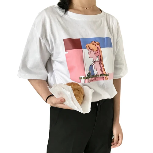 Новинка лета 2018, модные милые свободные универсальные Хлопковые женские футболки с коротким рукавом и мультипликационным принтом