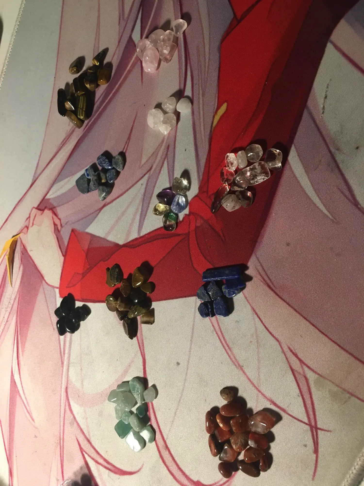 1-3 mm is almost like sand. but bigger sizes are great. There are tiger eyes, clear quartz, pink quartz, smokey quartz, moonstone, carnelian, green aventurine, sodalite and possibly onyx and obsidian.