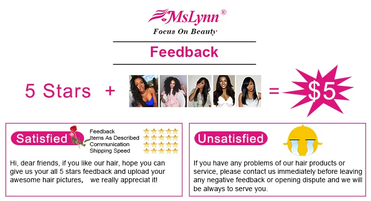 Привет, дорогие друзья, если вам нравятся наши волосы, надеемся, что вы предоставите нам свои отзывы со всеми 5 звездами и загрузите свои потрясающие фотографии волос на отзывы, это действительно большая поддержка нашей работы продавца. Это побудит нас сделать все лучше и лучше, чтобы обслуживать ваших клиентов. Мы обратимся к нашему боссу, чтобы вернуть вам $5 и отправить вам очень хороший подарок в вашем следующем заказе, чтобы показать нашу благодарность.