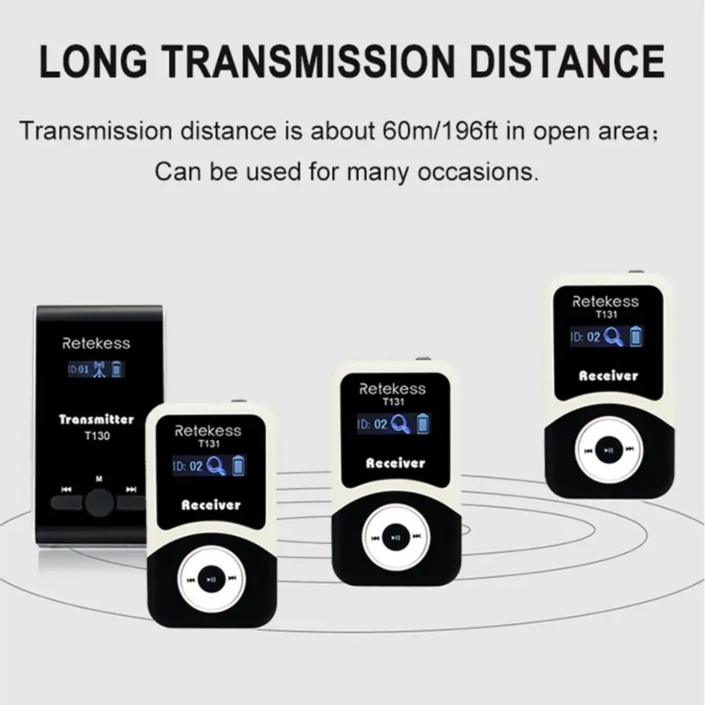 3. Рабочий диапазон:Рабочий диапазон Retekess T130 / T131 составляет до 50 метров на открытой местности. Убедитесь, что передатчик и приемники находятся в безбарьерной среде передачи.