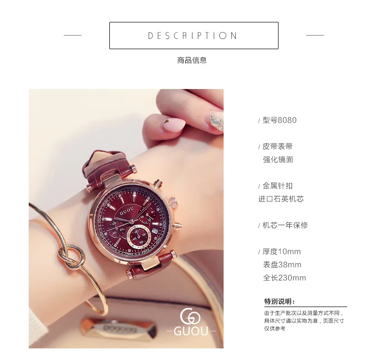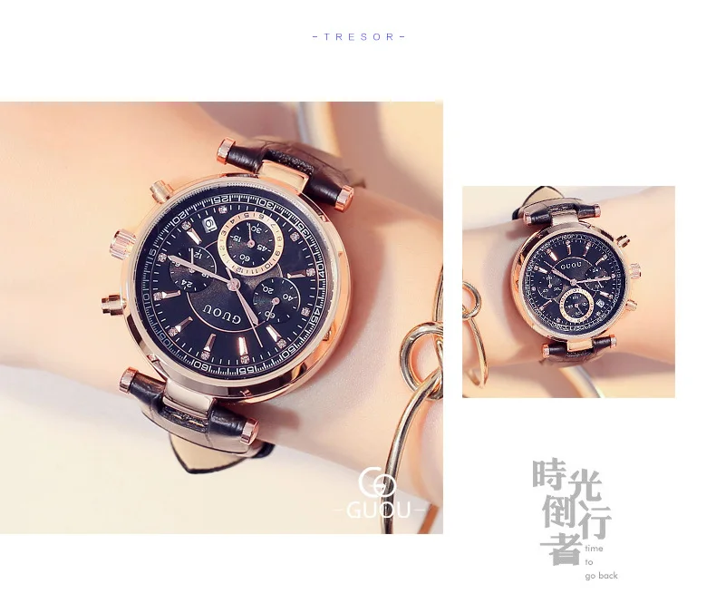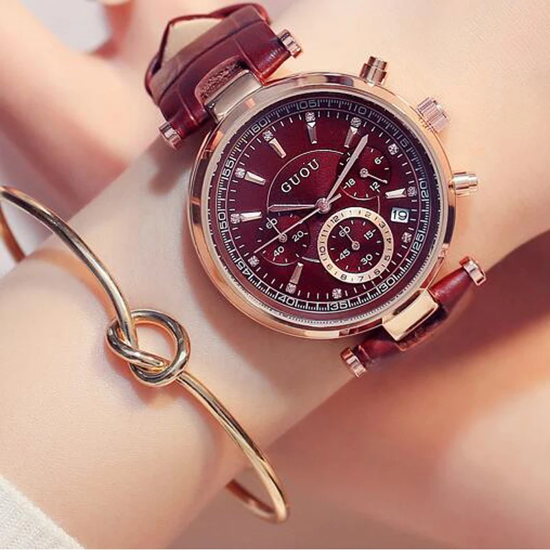 Часы наручные GUOU женские кварцевые, модные роскошные водонепроницаемые брендовые, с календарем на шести Контактах, с кожаным ремешком, подарок для девушек, 2018