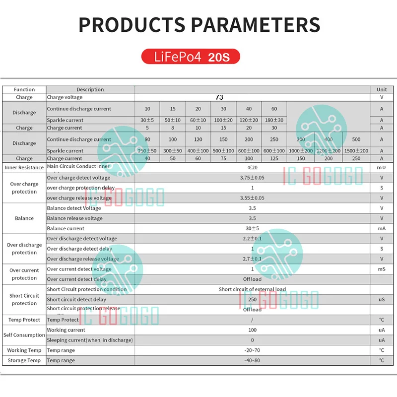Daly 18650 3,2 V LiFePO4 20S 60V BMS 30A 40A 50A 60A 80A 100A 120A ...