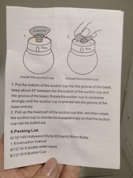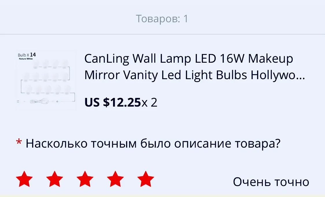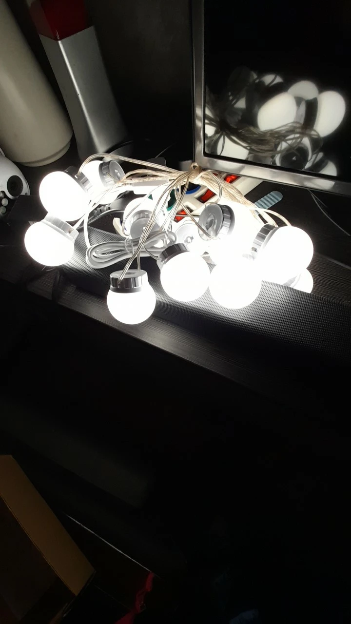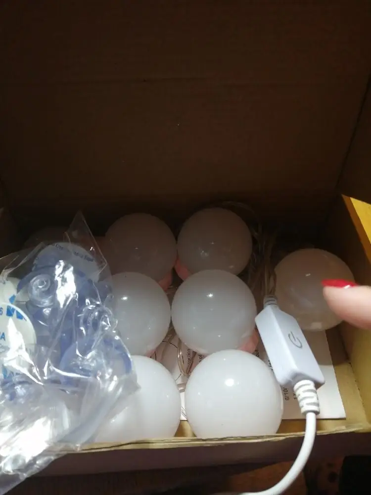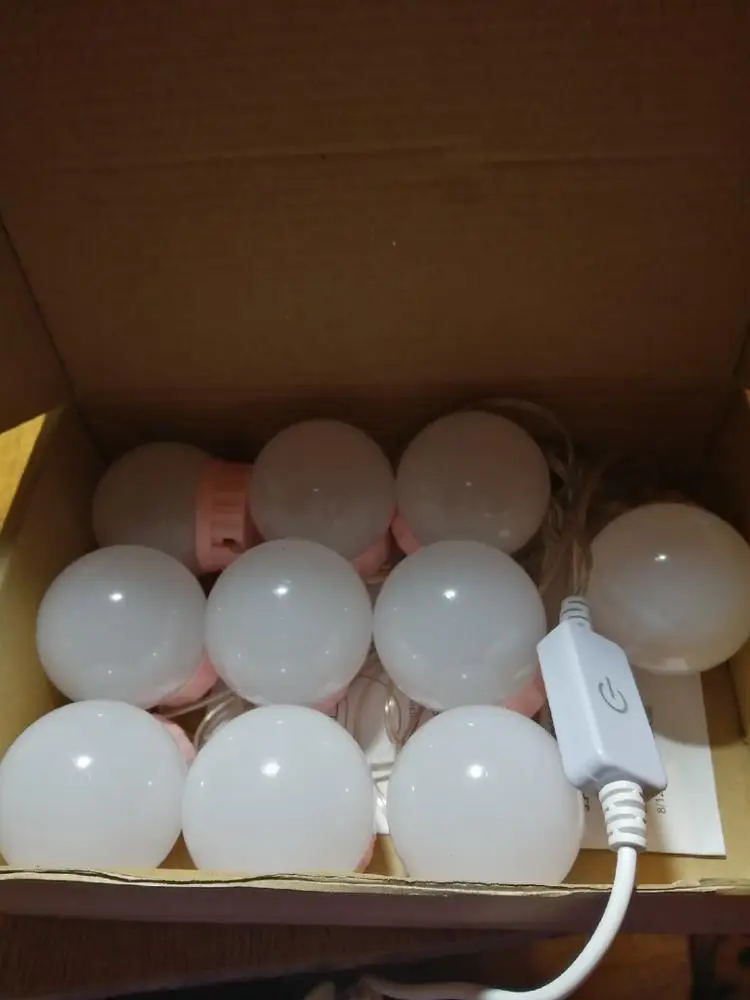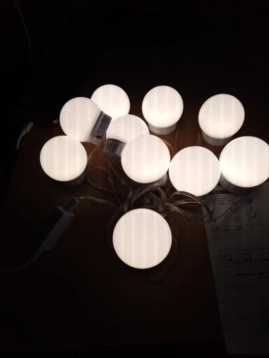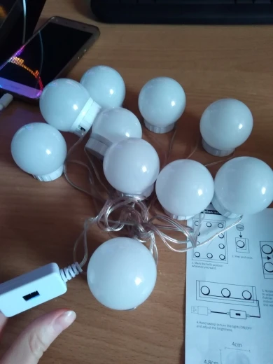 доставка в срок. лампочки как в описании. крепление, двусторонний скотч или присоски. свет мягкий, то что надо. доча довольна. спасибо. буду заказывать ещё на зеркало побольше, где 14 лампочек.