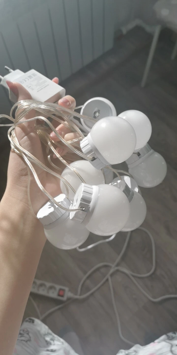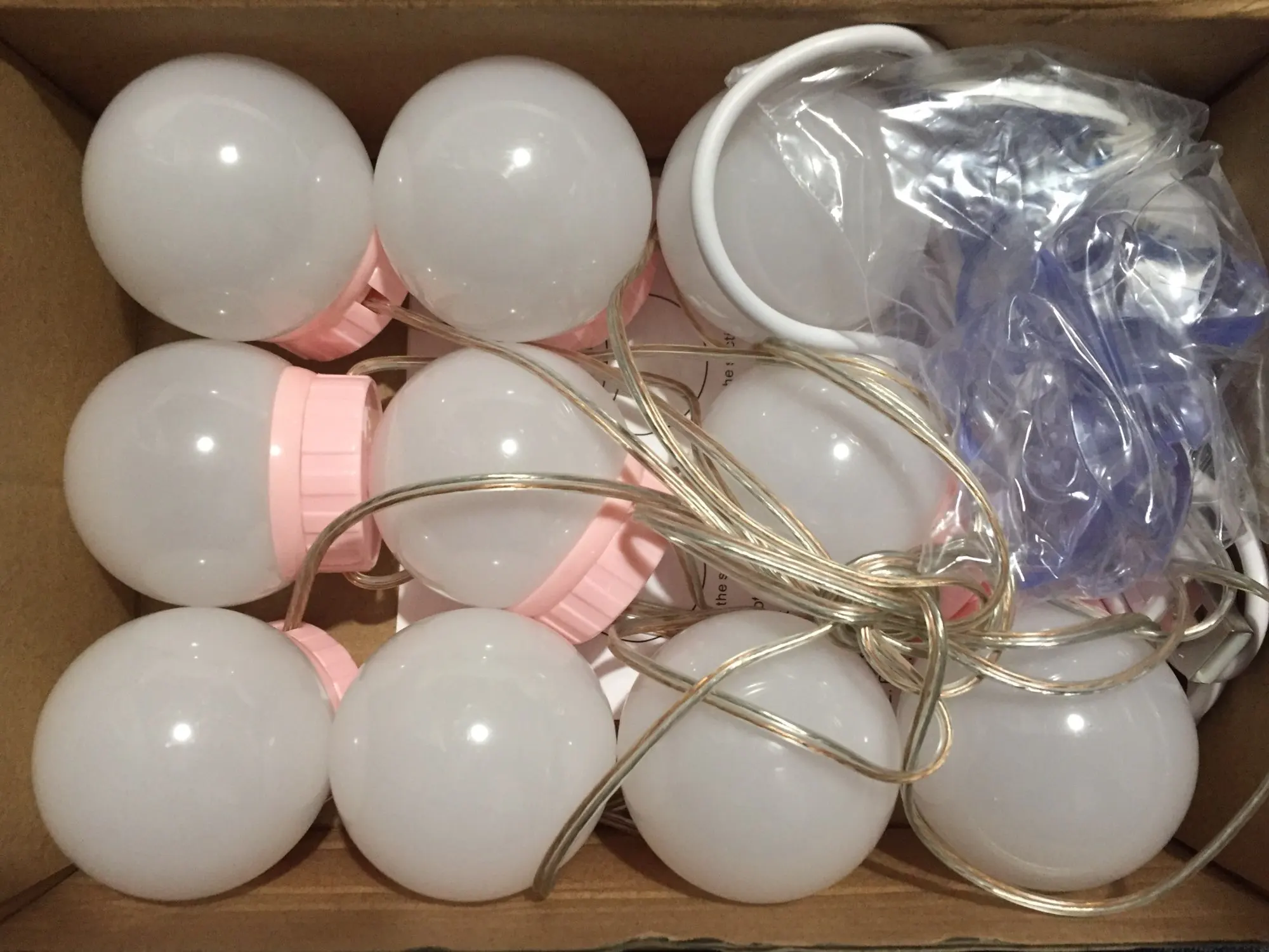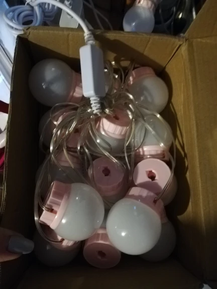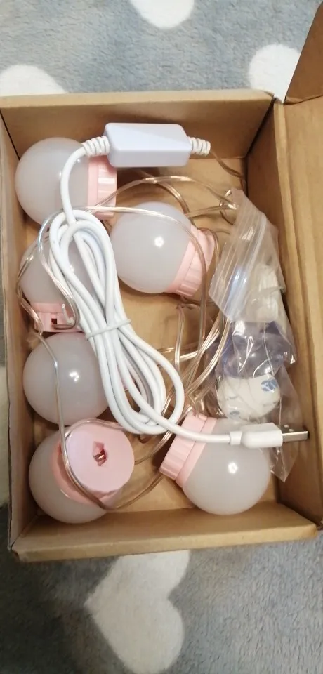Доставка 77 дней в Беларусь. По упаковке и качеству исполнения приятно удивили. Лампочки полностью из пластика, провода в силиконовой обертке, юсб кабель с выключателем, длинна 145 см. до выключателя, расстояние между лампочками 28 см. У лампочек с розовым цоколем виден розовый отлив при свечении. Покупкой доволен. Буду делать супруге зеркало. Рекомендую.