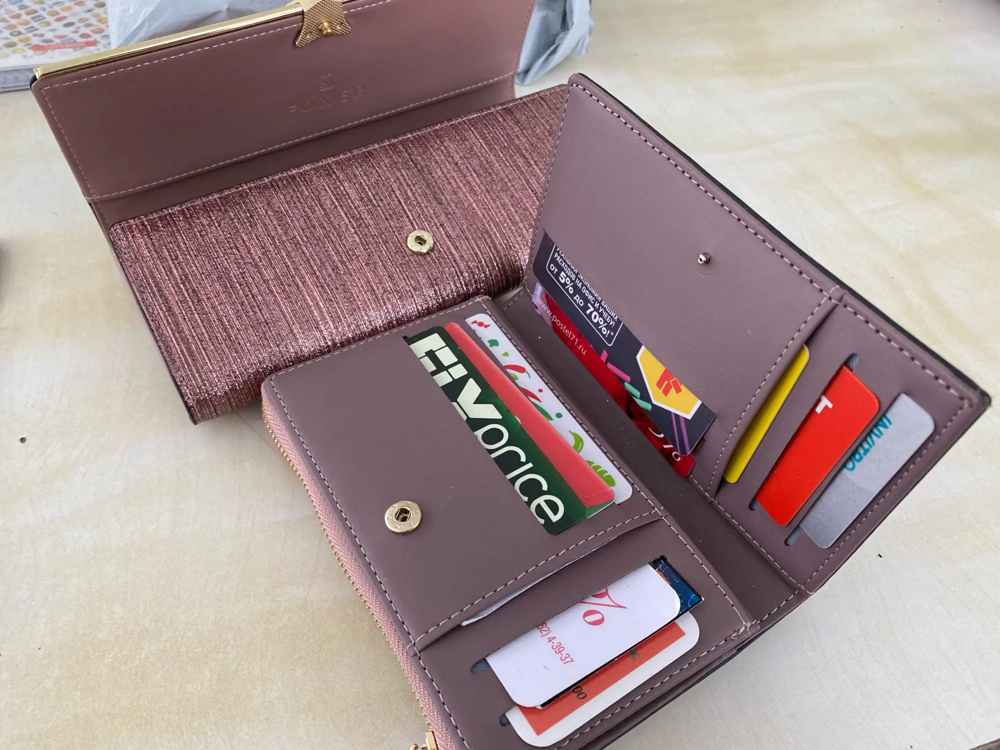 Очень красивый, аккуратный кошелек! Доставка-молния! Заказывала без подарочной коробки, но упаковано было все равно в коробочку, она помялась слегка, но не критично, кошелек не пострадал. Описаний и фото здесь хватает, все точно соответствует, углубляться не стану. Застежка показалась очень тугой, может поначалу так. Обошелся с скидками 1100р. На очереди теперь сумочка. У Foxer все такое красивое, хочеться иметь каждое изделие! Спасибо большое!