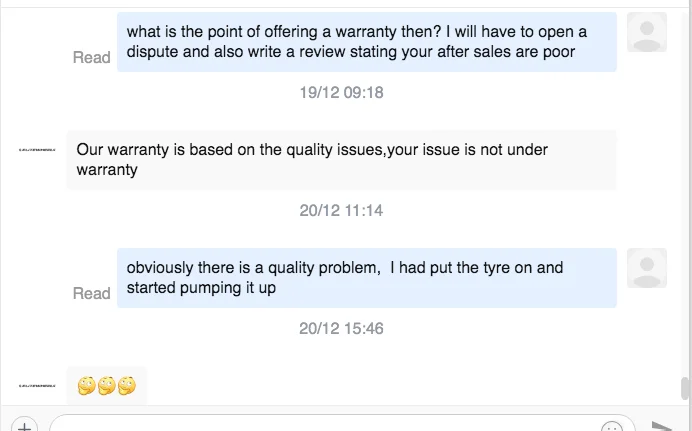 Обслуживание клиентов очень плохое, мои колеса заняли более 3 месяцев, и теперь я пришел, чтобы соответствовать шинам, колесо разделено, никогда не использовалось. Прямо сейчас они сказали, что это не проблема, и вы можете увидеть на прилагаемой фотографии, что их служба по работе с клиентами отправила 3 глупых лица на мой запрос.