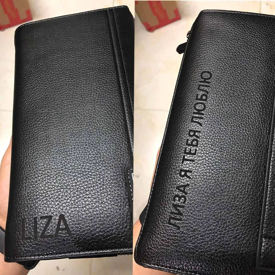 Очень большой кошелек/барсетка, такой и искала!!!! Я в восторге!!! Размеры соответствуют заявленным, ШИРОКИЙ действительно три пачки сигарет можно положить, как на фото продавца! Карманы глубокие! Не тяжёлый, замок металл, его хорошо бы смазать парафином(совет)! Внутри есть отделение на молнии и кармашек прозрачный (на моём фото видно тигра в этом кармашке). Заказывала шрифт F5, в процессе согласования была согласна и на F3, похоже его и сделали!