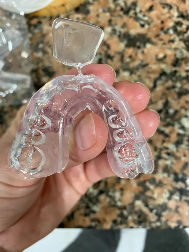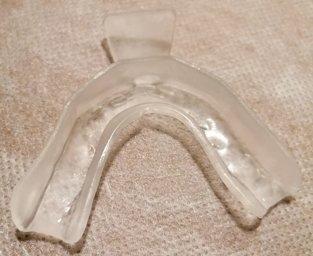 держим несколько секунд в кипятке, потом прижимаем плотно к зубам, как примет форму, держалку можно отрезать. Крутая штука чтобы на ночь гель наносить к зубам.