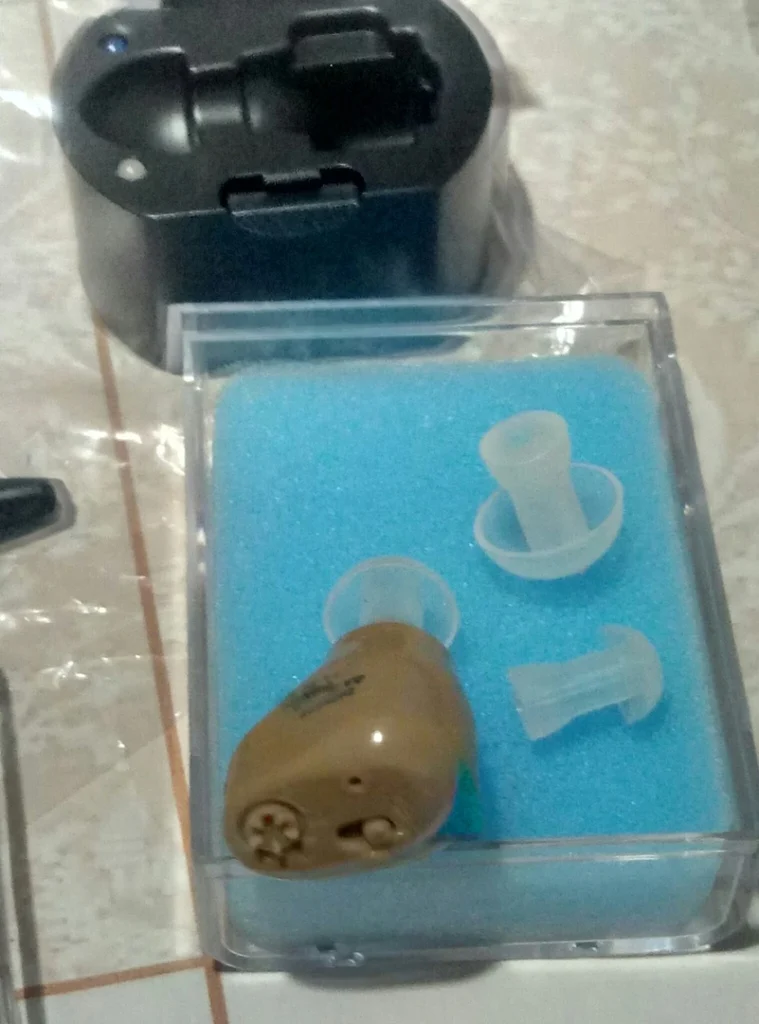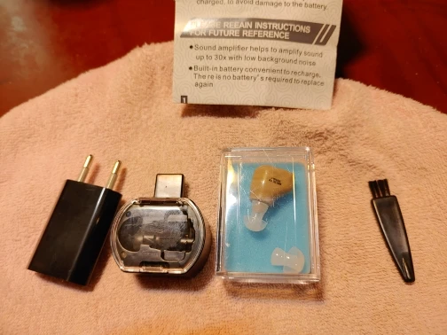 Отличный усилитель! Звук чистый, на малой громкости (2) бабуля слышит отлично. Выпадал из уха, я укоротила селиконовую насадку, теперь держится лучше. В комплекте зарядное - всё, как в описании. Бабуля довольна! Спасибо продавцу и удачи и процветания! Через месяц использования дополню.