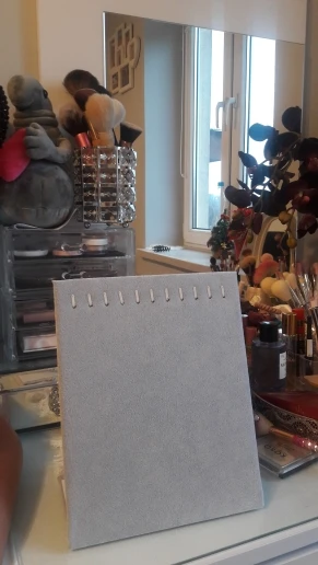 De buen tamaño y estable. Tiene para bastantes colgantes. Tela muy suave y gris bonito...como terciopelo. Entrega bastante rápida. Muy contenta con la compra