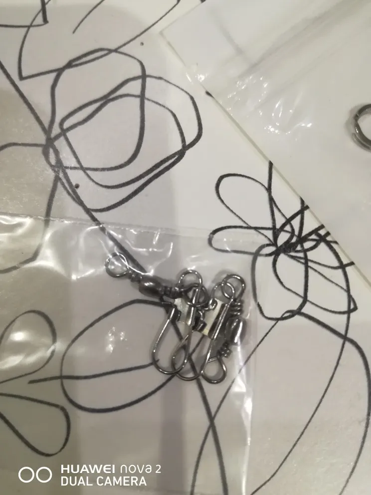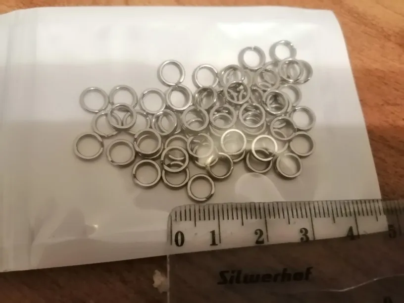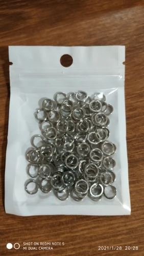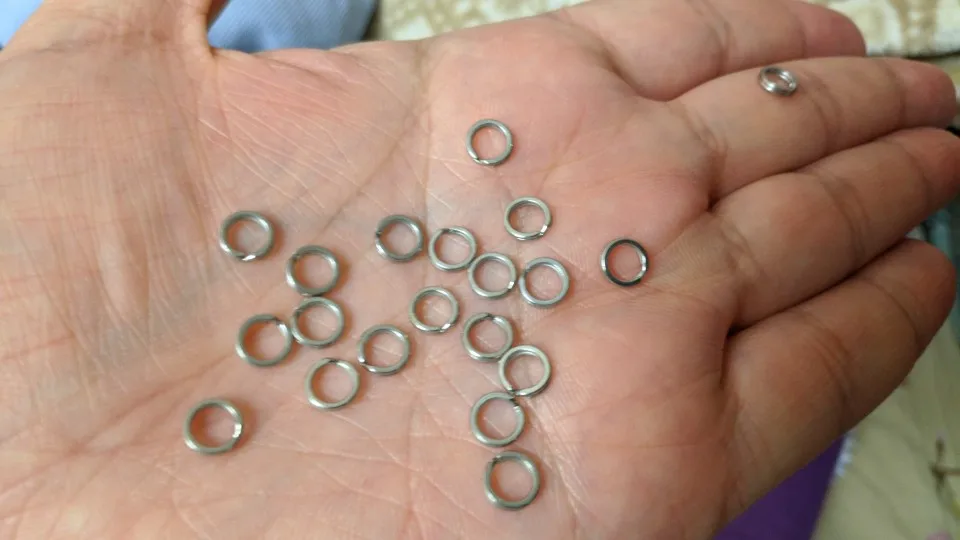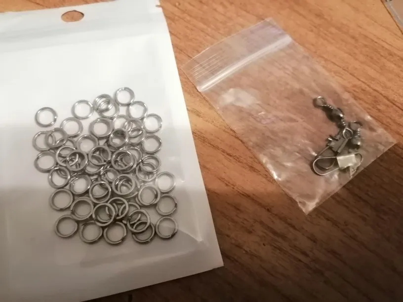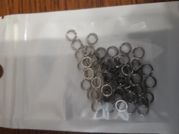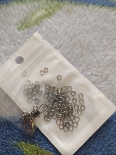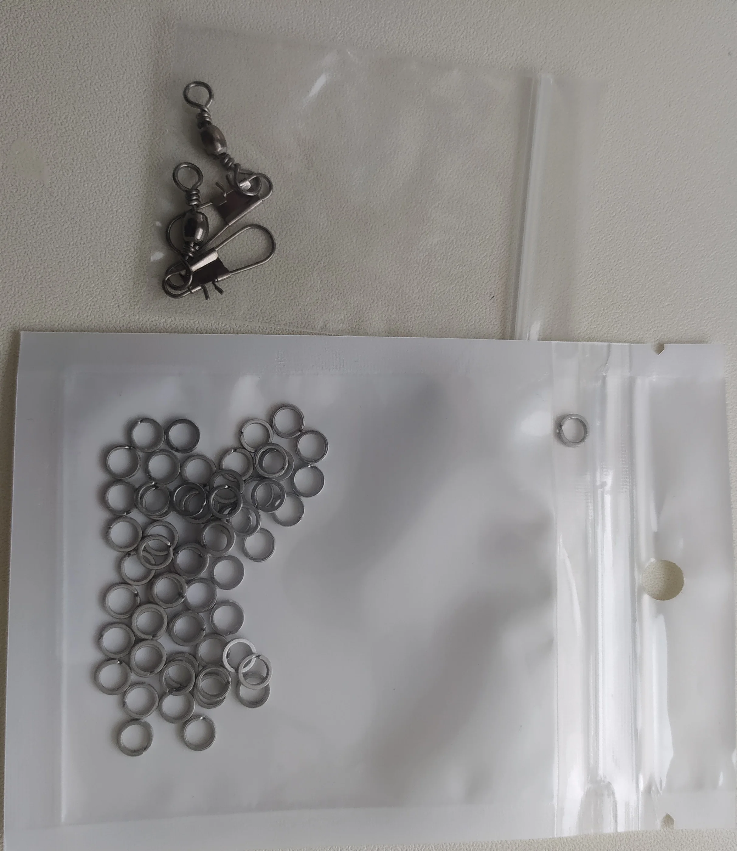 Хорошие заводные кольца. Плоские, есть расстояние между двумя концами. Однако в упаковке было 59 штук и из этих 59 одна бракованная то бишь 58. Однако продавец положил презент два карабина с вертлюшками. За свою цену хорошо 4/5 одназначно