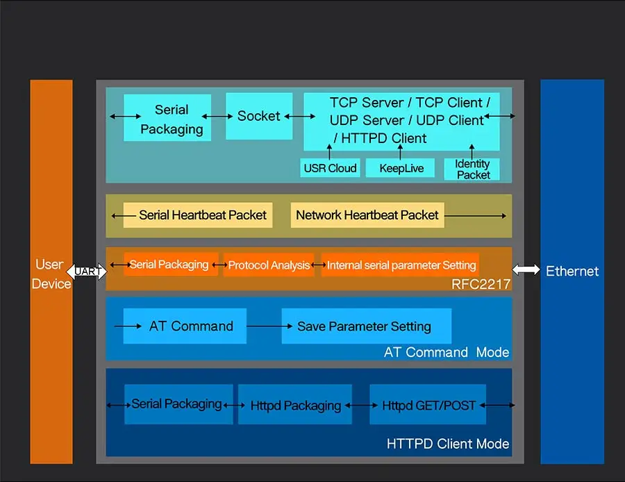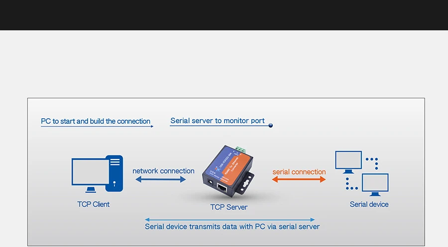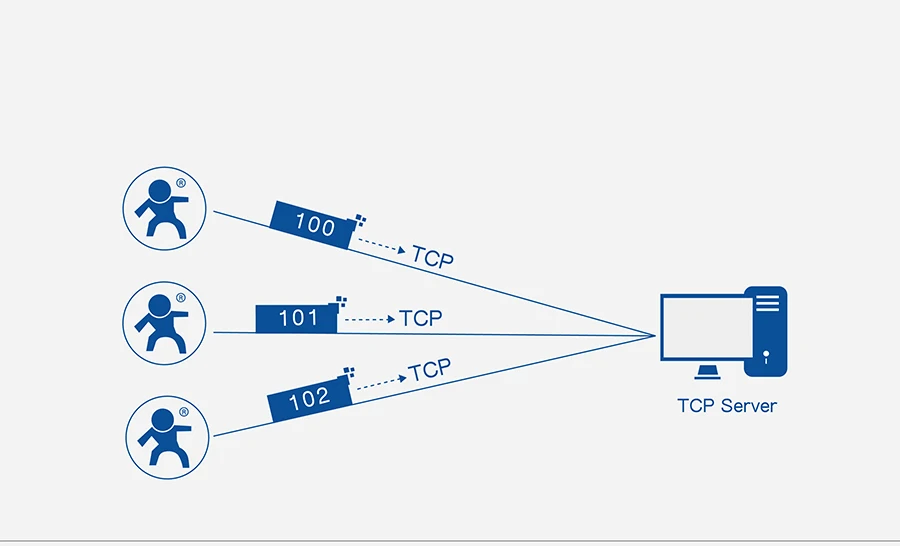 RS485 преобразователь Ethernet USR-TCP232-304 инициировать TCP соединение с ip-адресом назначения, который настроен пользователем и USR-TCP232-304, непрерывно старайтесь повторно подключаться при безуспешном подключении TCP. Если USR-TCP232-304 успешно устанавливает TCP-соединение с TCP-серверами, он может осуществлять двунаправленную прозрачную передачу данных между TCP-сервером и серийным устройством.