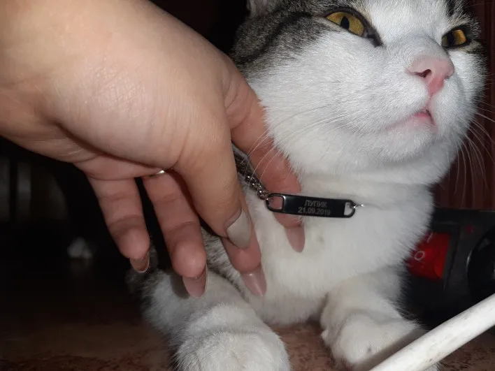 Надпись отличная, Все классно, но коту совершенно не подходит - кот пытается его слизать и звенья цепи зацепляются за зубы, после чего кот ходит и страдает, что не может закрыть рот. придётся сам адресник снимать с цепочки и пришить к простому ошейнику