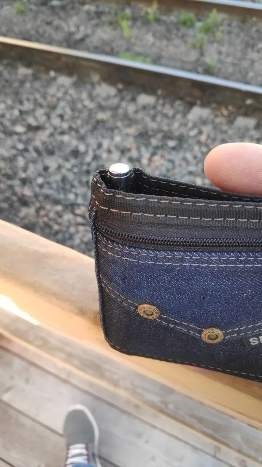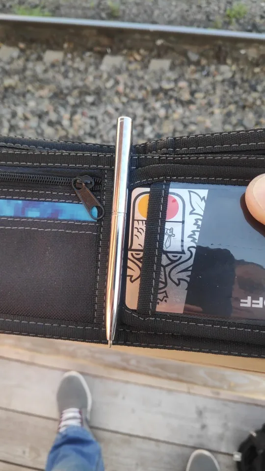 Соответствует описанию. Пробовал писать, вроде удобно. Для толстого портмоне в самый раз.