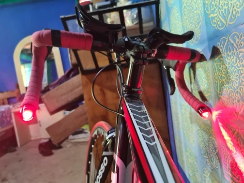 Как в описании. Очень яркий. Легко крепится на концах руля. Очень медленная доставка из-за пандемии.