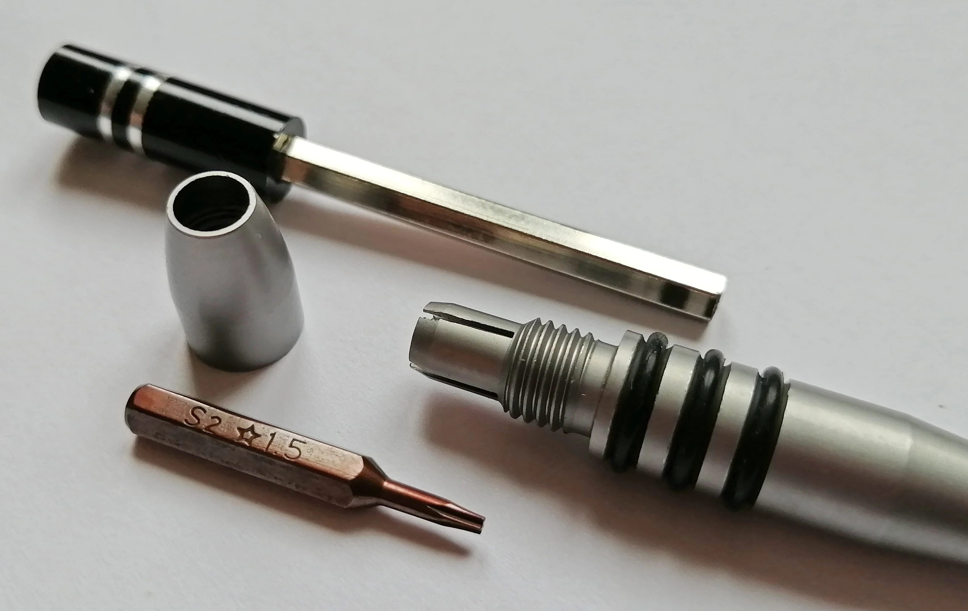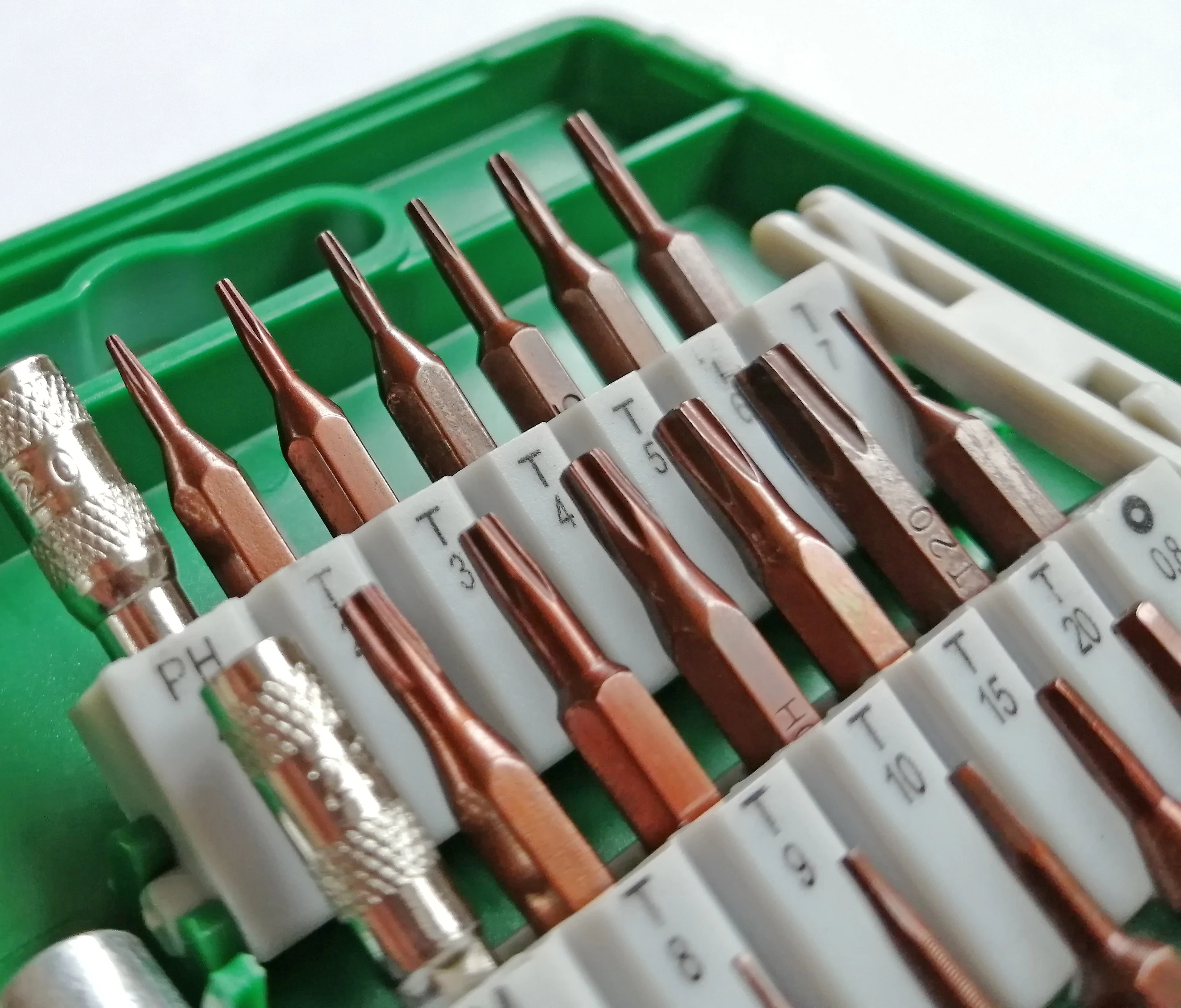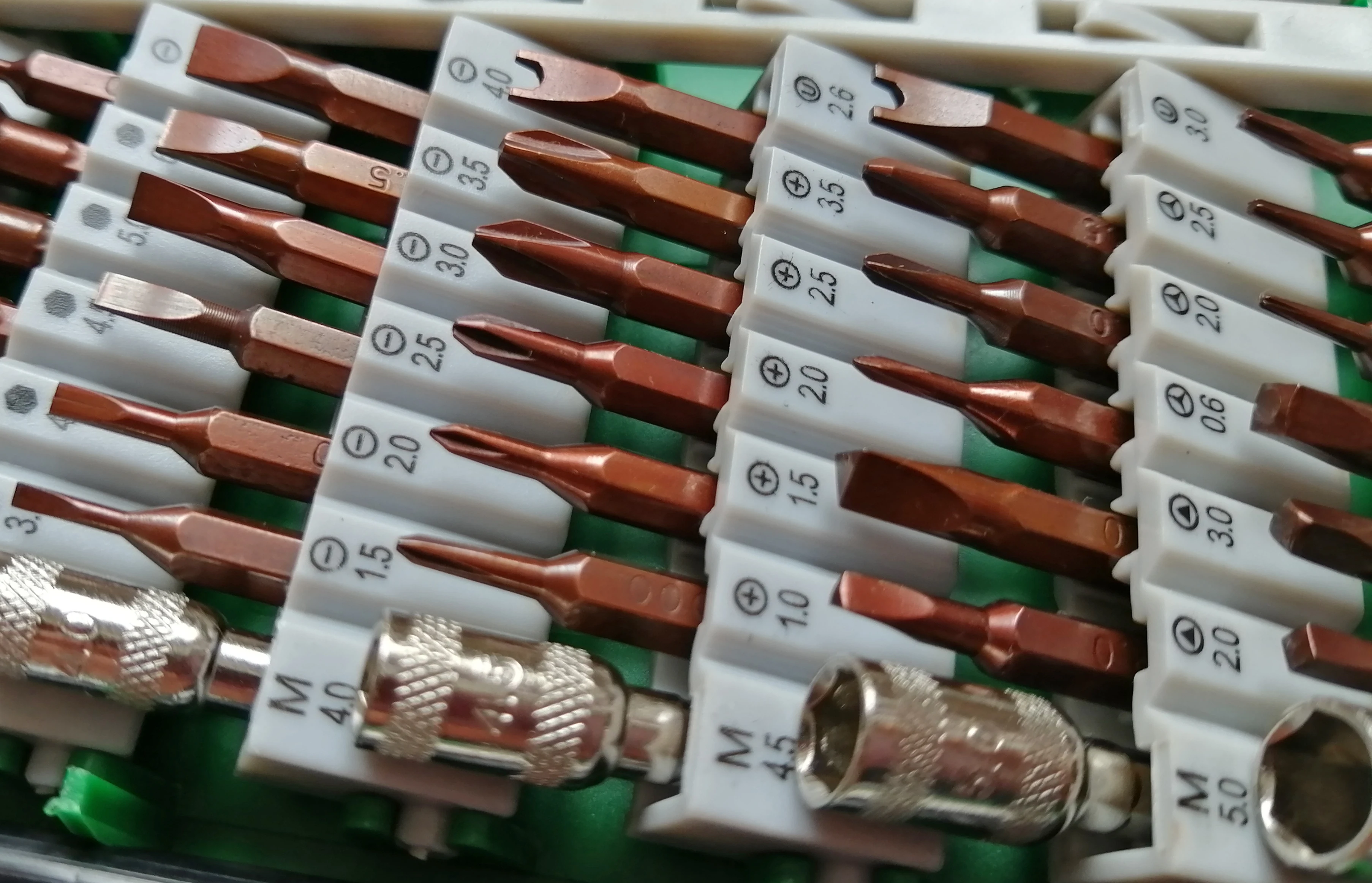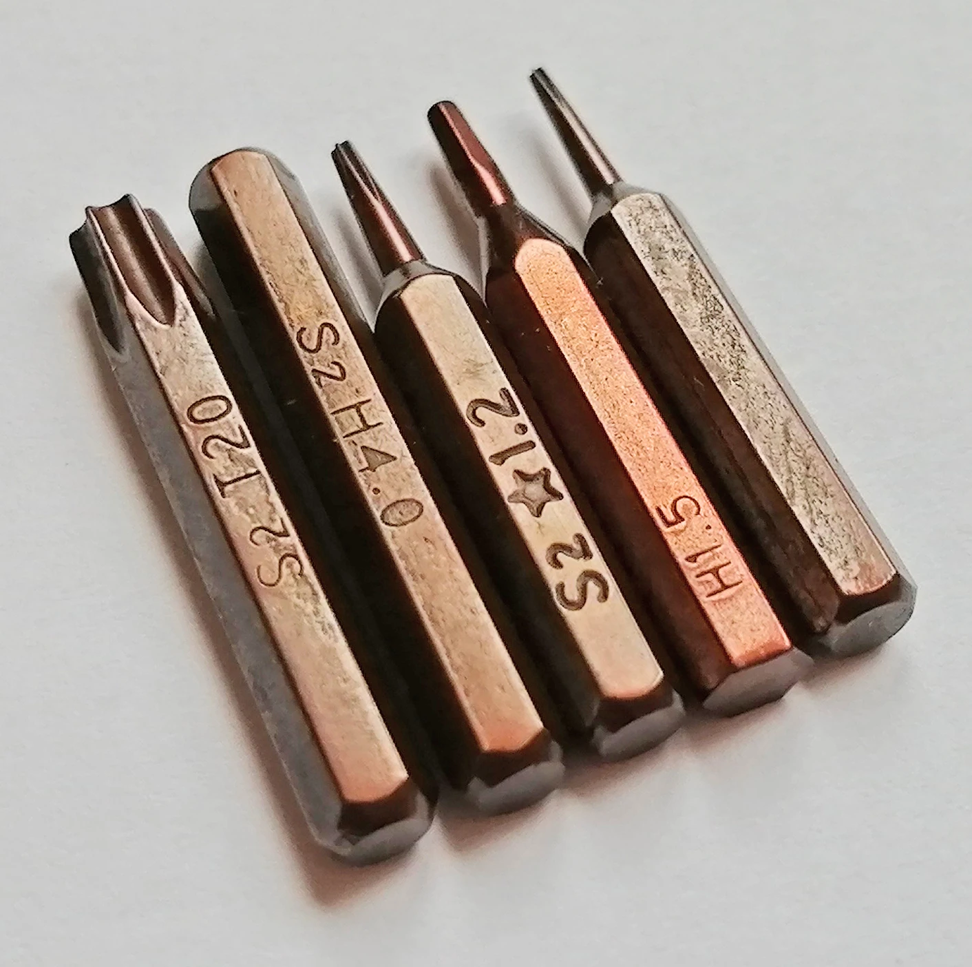 Заказ ехал долго. Биты измазаны маслом, и чем-то испачканы, не оттираются. Некоторые очень тонкие биты кажутся слизанными, надеюсь будут работать. Биты не держатся в коробке - если коробку перевернуть, то они высыпятся. В целом набором доволен. Большая часть бит выглядит чётко, металл крепкий, коробочка открывается и закрывается без проблем. Механизм подъёма бит работает хорошо. Могу рекомендовать к покупке.