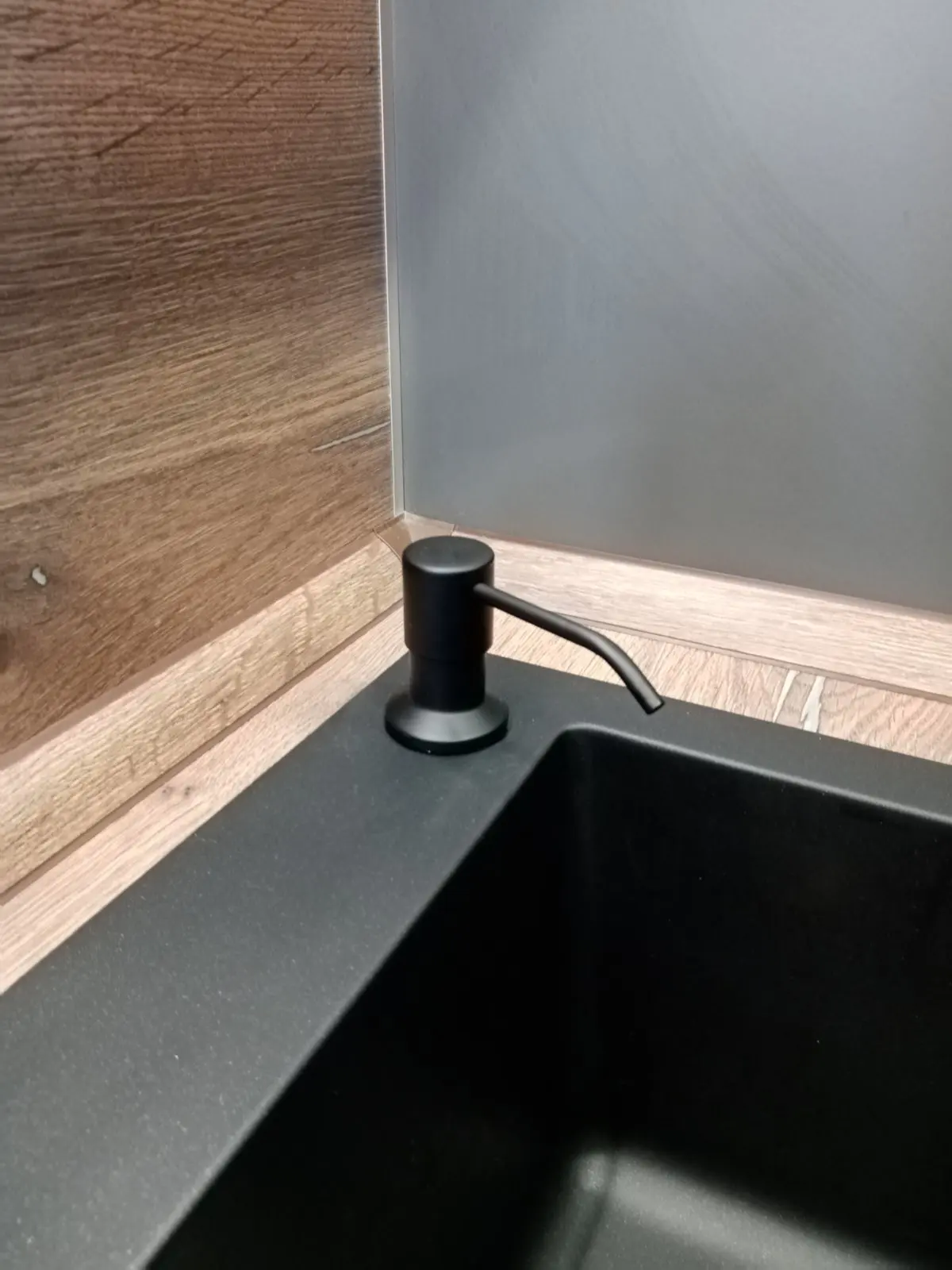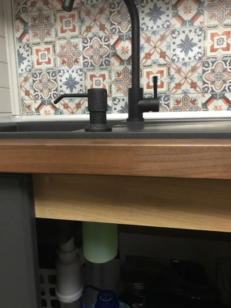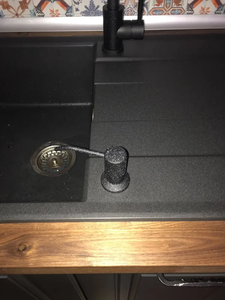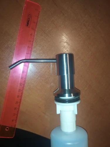 Всё соответствует! Доставка в Казахстан больше месяца, тут и наши постарались. Мойку под искусственный камень сверлил простым "пером" на 25, слегка шлифанул в конце пропила наждачкой и диспенсер вошёл с небольшим усилием и кручением. Сверху насос диспенсера просто извлекается для дозаправки, мыло заливать конечно не очень удобно, так как оно густое и воздуху трудно выходить, лучше вставить в открытый диспенсер трубку и, если надо, иногда её там бултыхать, помогая мылу стекать. Некоторые предлагают использовать длинную трубку, например от системы капельницы, и пятилитровую канистру мыла, чтобы навсегда забыть про заправку)) Но работает без замечаний, качает исправно, длины носика хватает, потом можно повернуть к крану, чтобы не мешался.