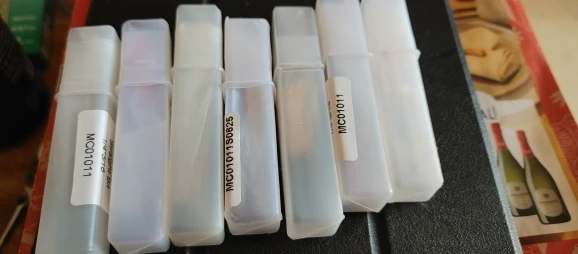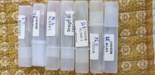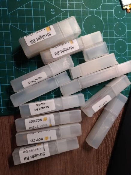 Приехали быстро. Фрезы качественные, режут отлично. Контейнеры, правда, говно, из рисовой бумаги, в руках разваливаются. Заточка фрез отличная, хвостовик встал в размер цанги без люфта. На фото - первая проточка ручным говняным фрезером. Пропил сразу на требуемую глубину (5 мм). Никаких затруднений. Всё пучком. Рекомендую.