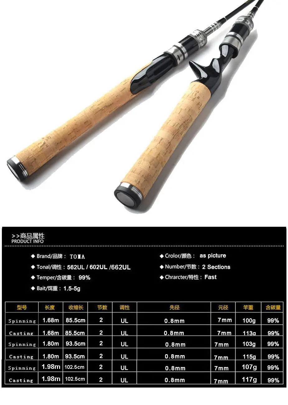 Удочка TOMA из углеродного волокна спиннинг; Удочка;, 2 секции, 1,8 м, 602UL, вес 1,5-5g, твердый карбоновый наконечник