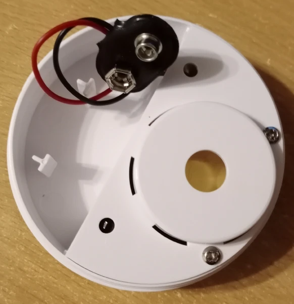 Батарейка крона требуется, орет громко очень, можно уменьшить громкость чуть повернув крышку и перекрыв отверстие динамика, на нижней части небольшие ножки, подточил их чтобы ложились на поверхность непосредственно контактами.