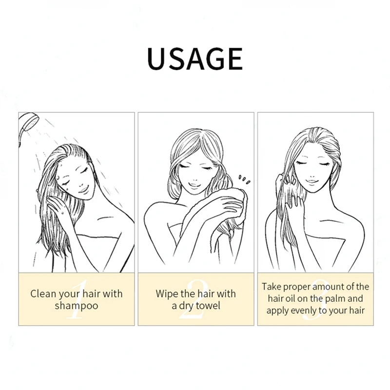 Применение: после очистки волос нанесите соответствующее масло для волос и намажьте его на волосы,Массируйте кожу головы маслом для волос до тех пор, пока он не впитывается волосами, не нужно очищать.