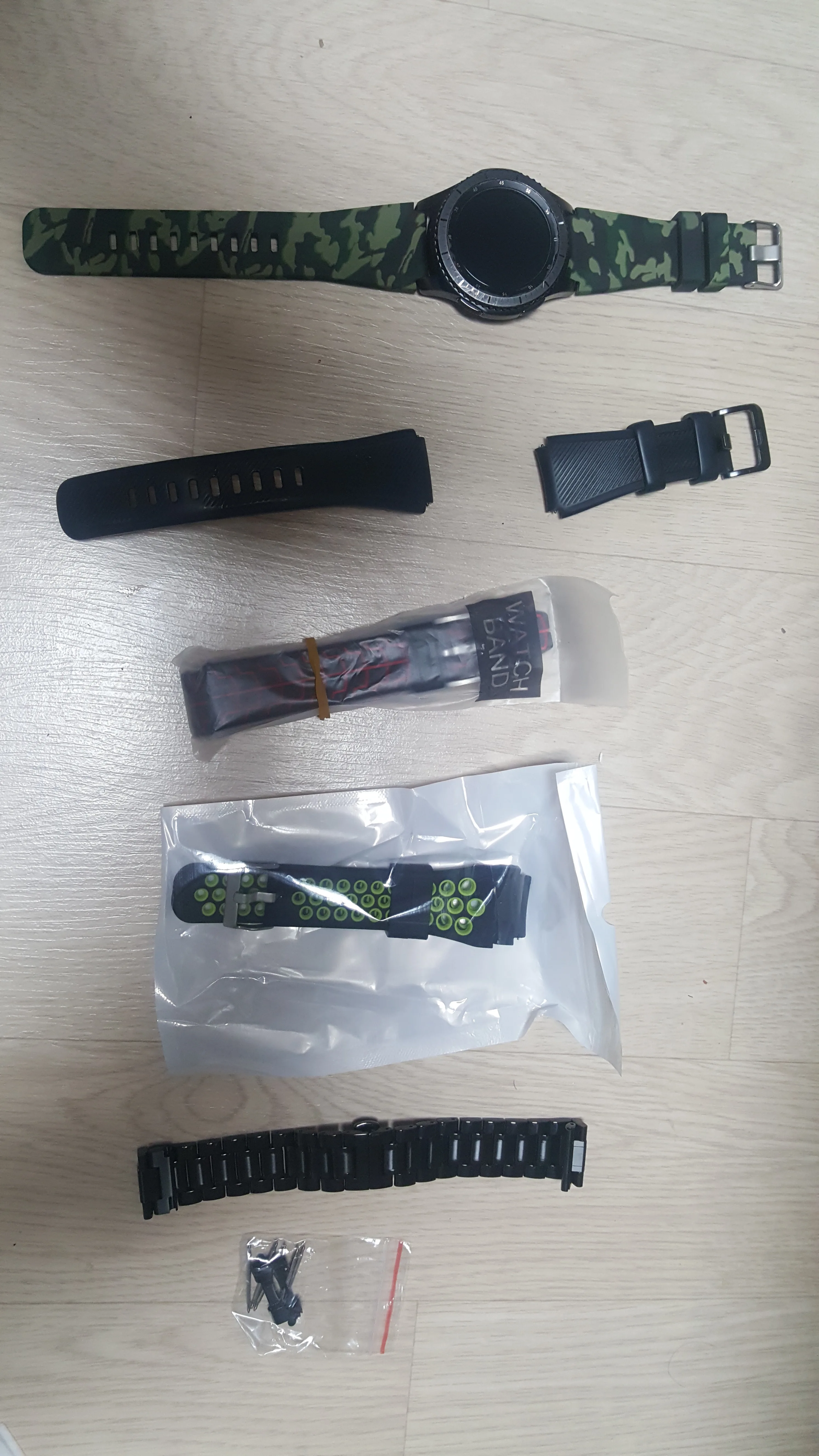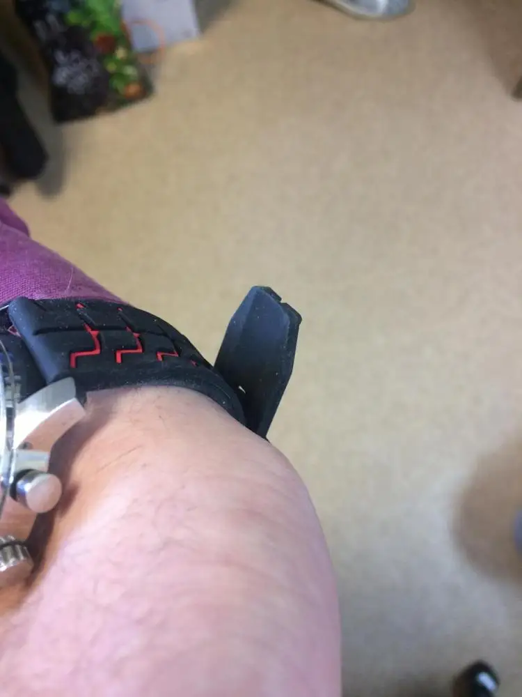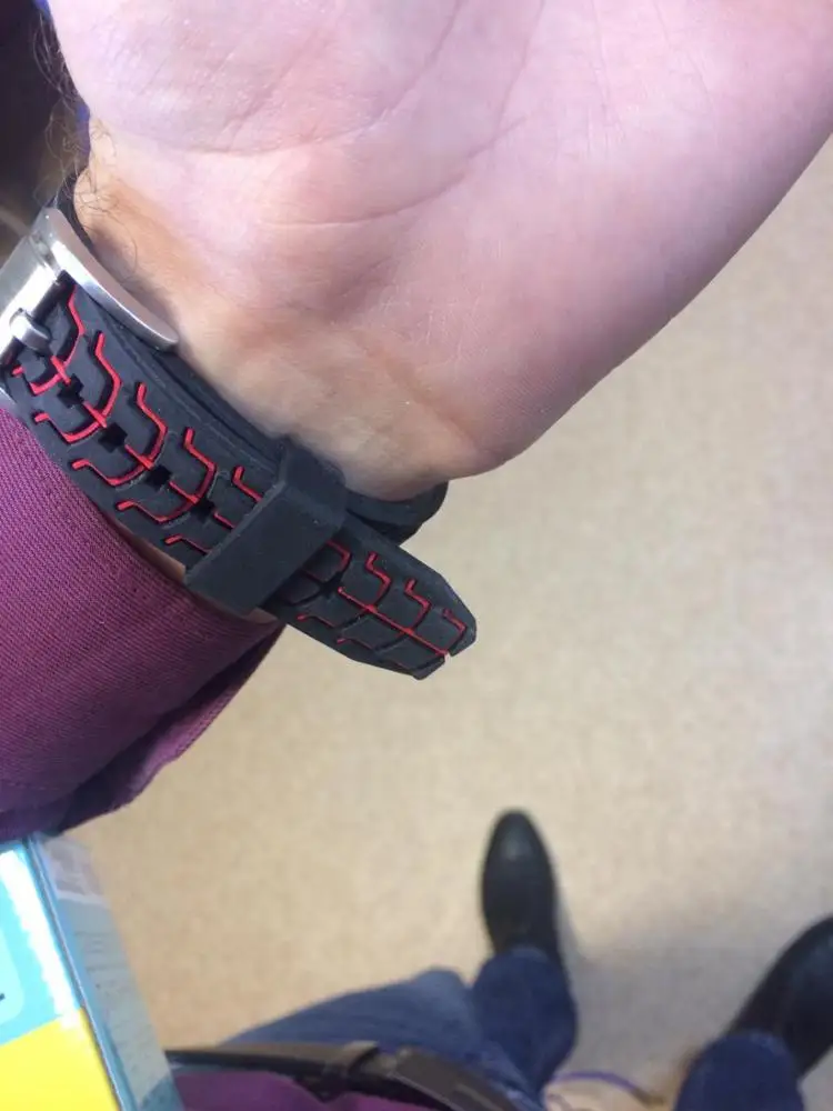 Ставлю 5 звезд продавцу. быстро отправил. в комплекте 2 железные херовины для ремешка. и какая-то отвертка для замены. оч удобно снимать старый ремешок. Теперь по поводу самого ремешка. Смотрится интересно. красиво пока лежит на столе. Через 3 часа ношения ремешок стал серым. пошоркался об манжет рукава и черный перестал быть черным. на фото не видно. глазами заметно. красные линии видно когда смотришь перпендикулярно, немного руку повернул и уже не видно, потому что линии "утоплены" внутрь браслета. По поводу всех резиновых ремешков - всегда сук@ оттопыривается хвостик ремешка. Всегда! ибо он резиновый и пытается распрямиться. колечко для фиксирования этого хвостика всегда съезжает к запястью и хвостик снова оттопыривается и цепляется за все подряд. второй раз покупать не буду!