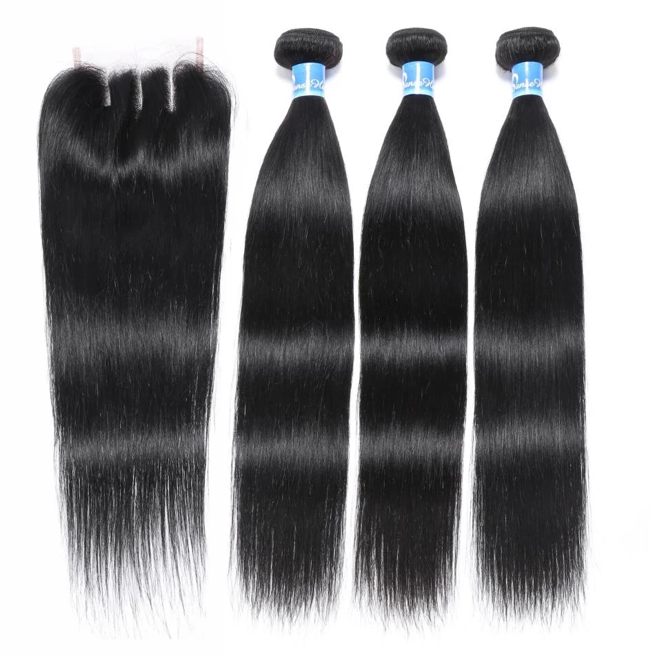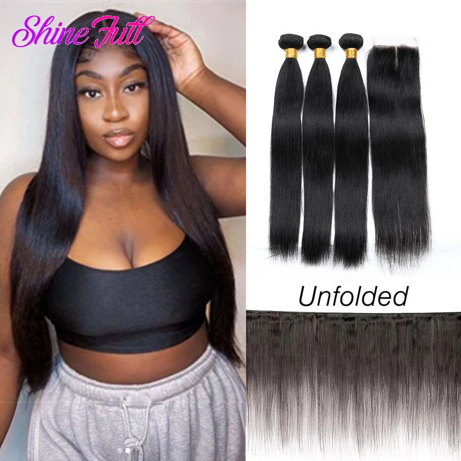 ShineFull Малазийские Волосы 3 пряди с кружевной застежкой 4x4 шелковистые прямые 100% человеческие волосы для наращивания не Реми двойные пряди