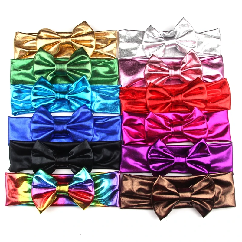 Повязка на голову для девочек, блестящая, однотонная, 4 дюйма, галстук-бабочка цвета металлик, 2 шт., повязки голову-большой бант