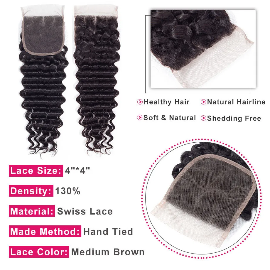 Шикарные волосы, глубокая волна, кружевная застежка, бразильские неповрежденные человеческие волосы, застежка 4*4, швейцарская кружевная застежка, среднийсвободныйтрехкомпонентный естественный цвет