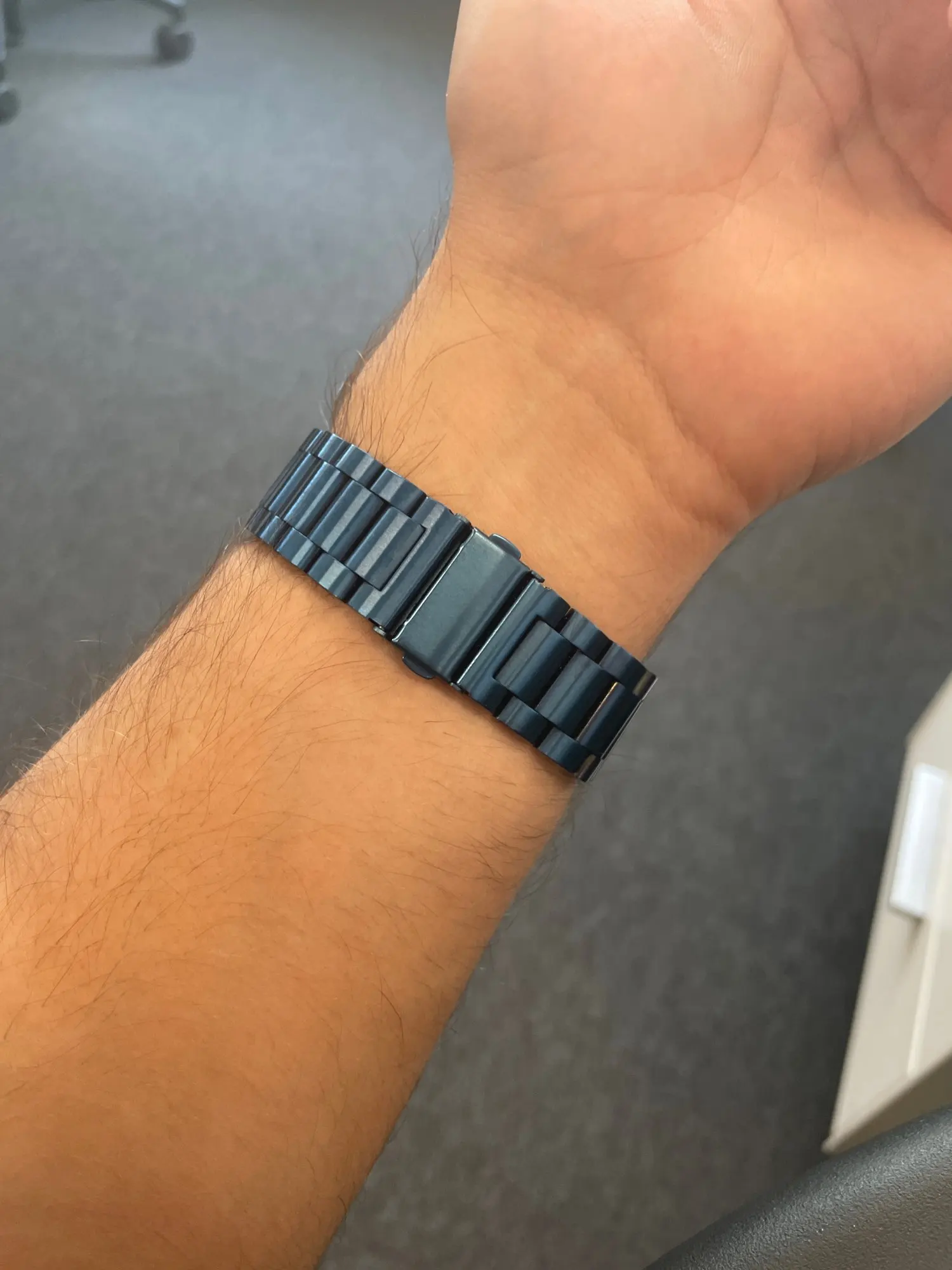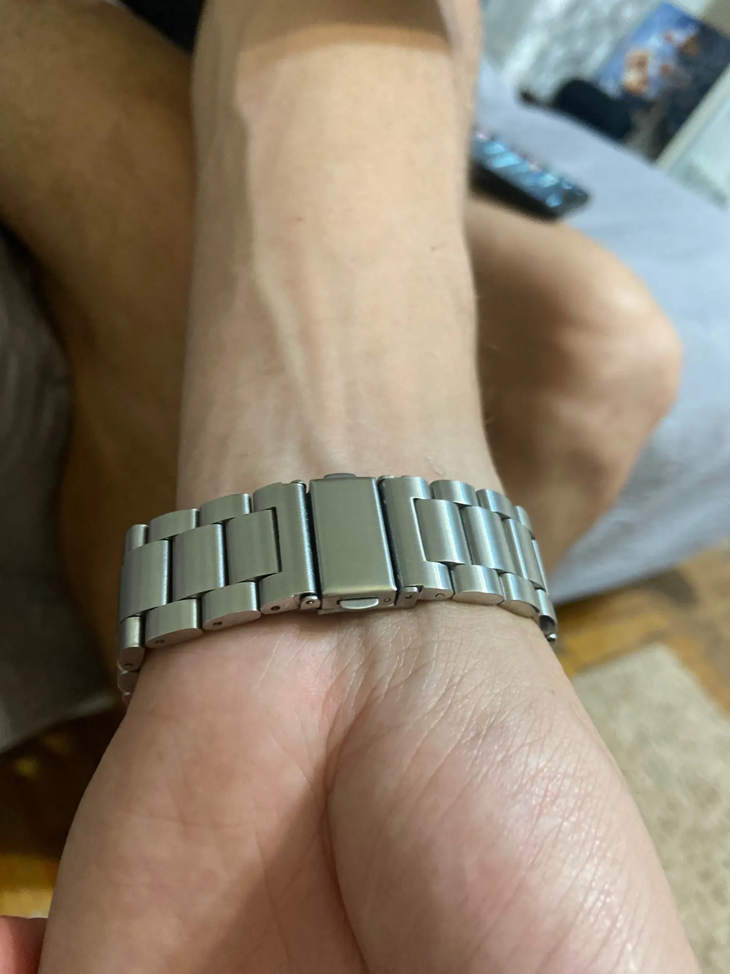 Симпотный ремешок. Выглядит, как на фото продавца. Дошел достаточно быстро. Цепляется легко. Сразу убрал лишние звенья (инструмент в комплекте). Достаточно лёгкий (вряд ли из нержавейки). з Застёжка оч удобная (привык к подобной давно)
