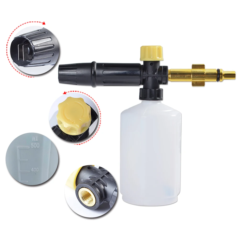 Продукт очень хороший, протестирован моющим средством, а пена очень плотная и кремовая. Вообразите, что собственный шампунь для автомобилей будет намного лучше. Продукт пришел правильно, насадка штуцера шайбы металла, 500 мл пластиковый контейнер прочный, спрей с регулировкой, фильтр и тефлоновая лента.
