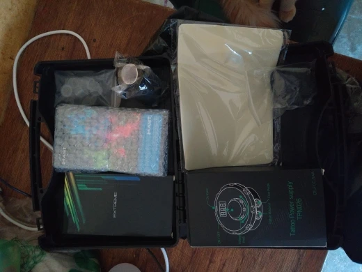 Доставка заняла 10 дней. Привёз курьер. Отличный набор. Содержимое очень порадовало. В набор входит машинка с педалью, картриджи, защитная лента, чёрная краска, перчатки, силиконовый коврик, и 5 колпачков под пигмент. Все целое. Машинка работает. Очень довольна покупкой. Буду покупать теперь у этого продовца