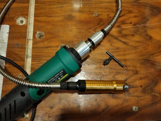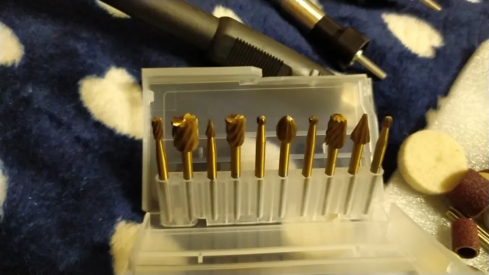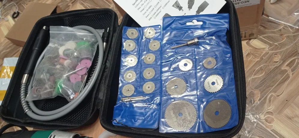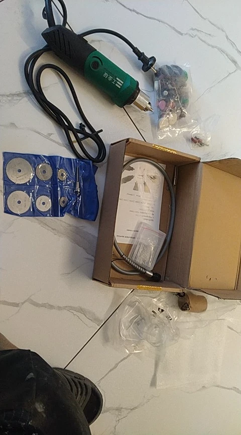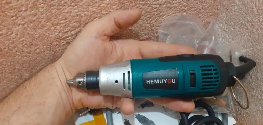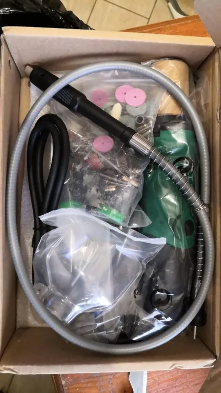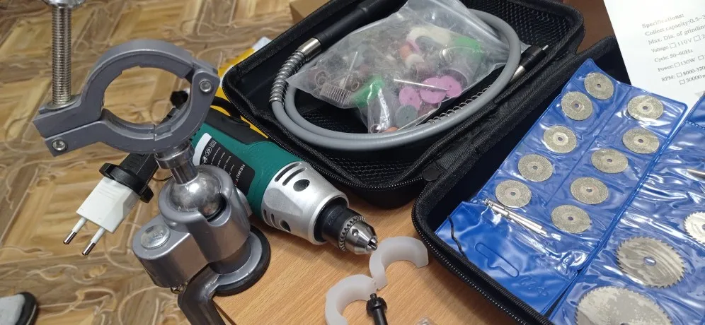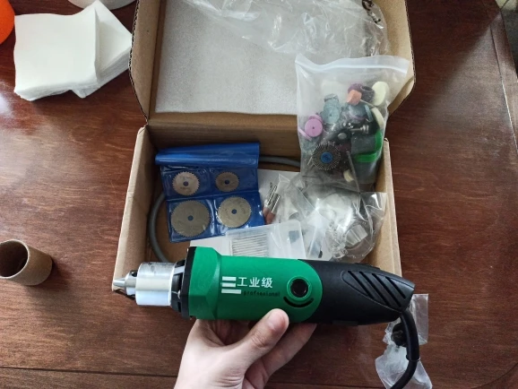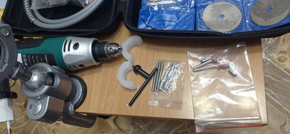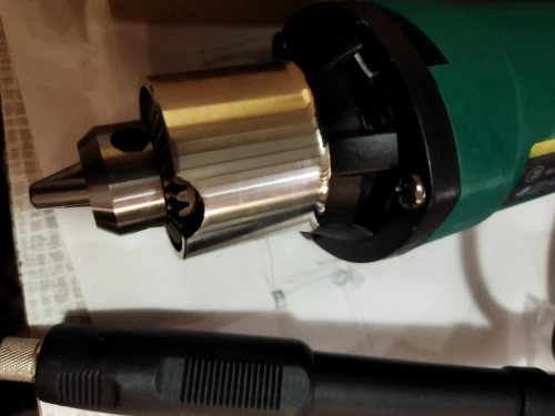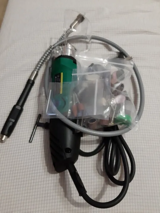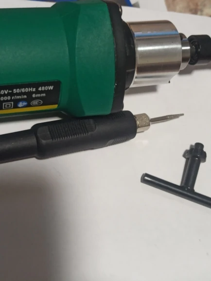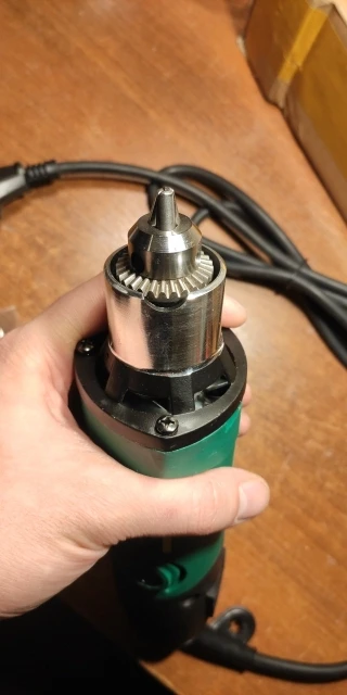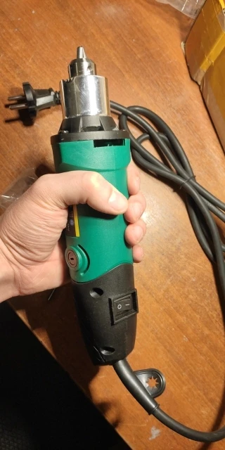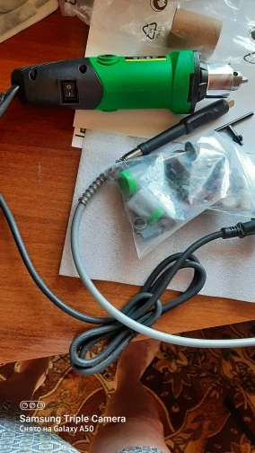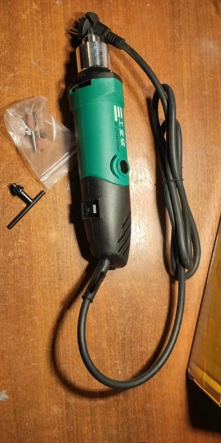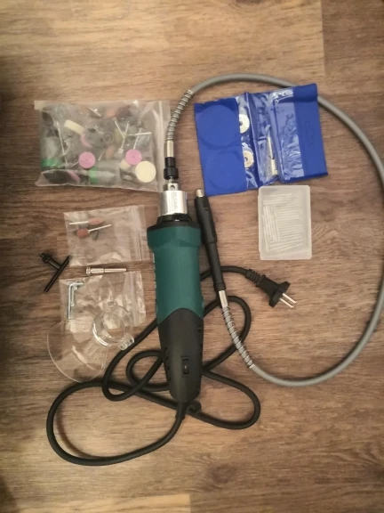 Ожидал что будет мощнее, но с обычным гравером все равно не сравнить. Комплект большой, не пересчитывал, вроде все на месте. Не вибрирует, работает ровно, боковые нагрузки хорошо держит, надеюсь там подшипник а не втулка. Очень удобно с патроном. Ключ от дрели не подходит, здесь меньше размер