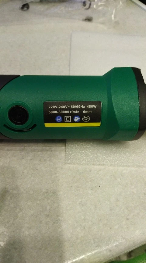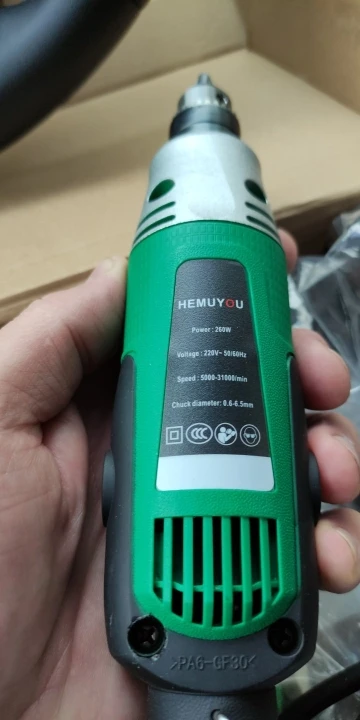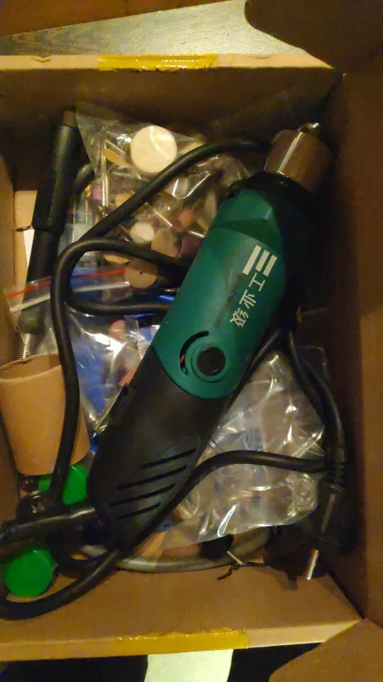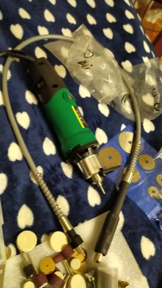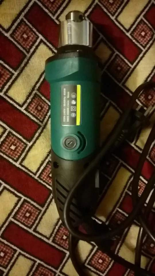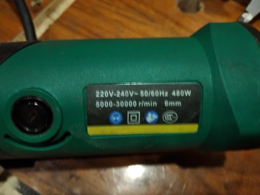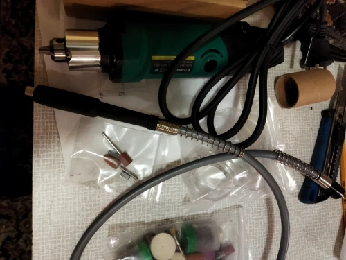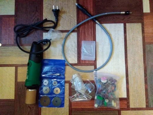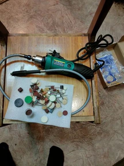 До Екатеринбурга - неделя, и всё в порядке. Все примочки были в одном пакете, просто раскидал их по маленьким "тематическим" пакетикам. 480 W с патроном. Может, тяжеловат для гравера, но очень уж тонких работ не предвидится, а для мелкой обработки вполне себе держит рука. Осталось только подвес какой или "кОзлы" сочинить, чтоб как стоматолог)). Греется как у всех. Первым делом обтесал эту странную коробочку вокруг выключателя с помощью самой же машинки, а то пальцам неприятно было ощущать её острые углы. Малая цена и быстрый нагрев машинки диктуют эксплуатировать её нежно. И поскольку патрон руками не покрутишь из-за конструкции, а всё ключиком эксклюзивным вращать приходится, то и если сам ключик изолентой к проводу примотать - несподручно будет зажимать. Короче, ключик беречь надо.