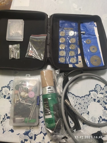 Товар доставлен быстро. Все соответствует описанию. Чемоданчик из текстиля, маленький. Все насадки в пакетиках. Для них надо приобретать отдельный органайзер. Гравер работает. С продавцом не общался, но рекомендую.