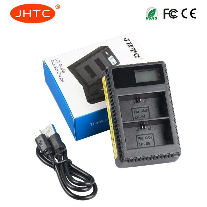 Jhtc LP-E6 светодиодный Дисплей Li-Ion Батарея Зарядное устройство пакет 2-Slot USB набор кабелей для цифровой однообъективной зеркальной камеры Canon EOS 6D 7D 70D 60D 5D Mark III Mark II ЖК-дисплей Зарядное устройство для камеры Особенности: Защита от короткого замыкания Светильник вес, легко носить с собой Изготовлен из материал высокого качества, прочный и удобный Интеллигентая (ый) Светодиодный индикатор состояния из нержавеющей стали для лучшей защиты Параметры для зарядного устройства 1. Вход: DC 5V/2A (макс) 2. Выход: 8,4 V/800mA(x1) постоянного тока 8,4 V/600mA(x2) 3. свет: 20x55x75mm 4. Светодиодные дисплеи зарядки уровень мощности.