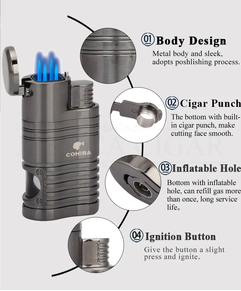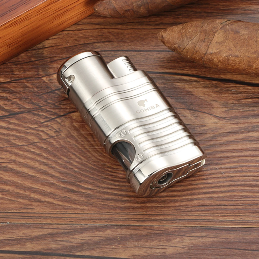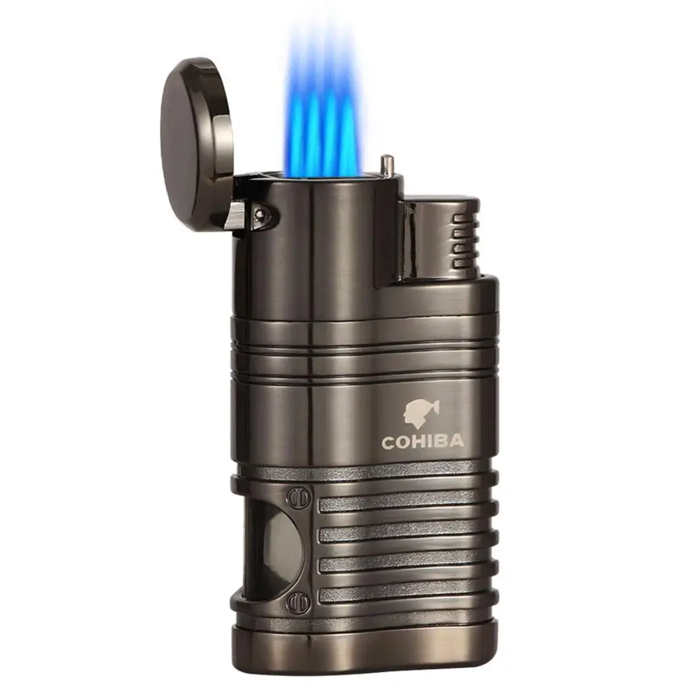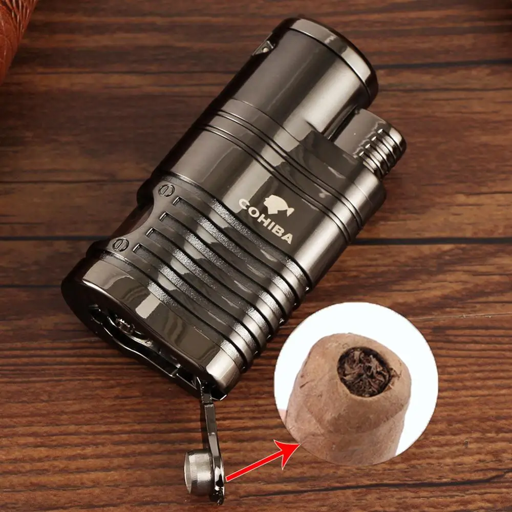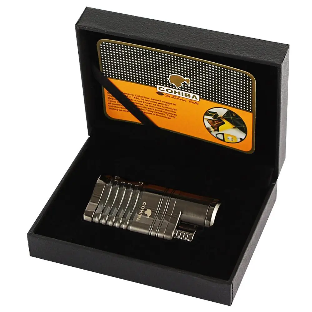 Факел COHIBA, зажигалка для сигар, портативная металлическая, ветрозащитная, 4 синих огня, струйная сигаретная, зажигалка для курения, газовая
