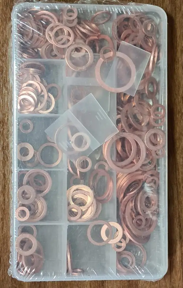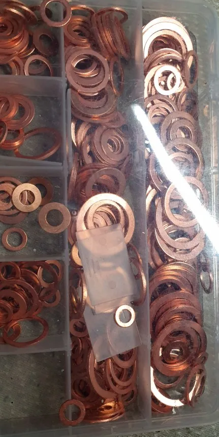 Очень хорошие медные уплотнительные шайбы. К сожалению, пластиковая коробка, где шайбы видели, очень низкого качества. Перегородки были свободны при транспортировке, и все шайбы смешаны вместе внутри коробки. Это большой бардак. Медные шайбы очень хороши. К сожалению, пластмассовая коробка, где пила шайбы, очень плохо. Перегородки, выпущенные в доставке, и все шайбы смешаны внутри коробки. Это большой бардак.