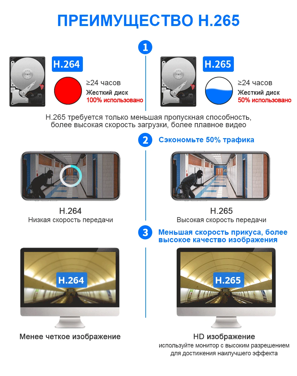Сжатие H265. По крайней мере, это записано в настройках. Для этого, плюс, так как у меня был другой HBP и другой продавец с форматом H264, вместо обещанного H265.