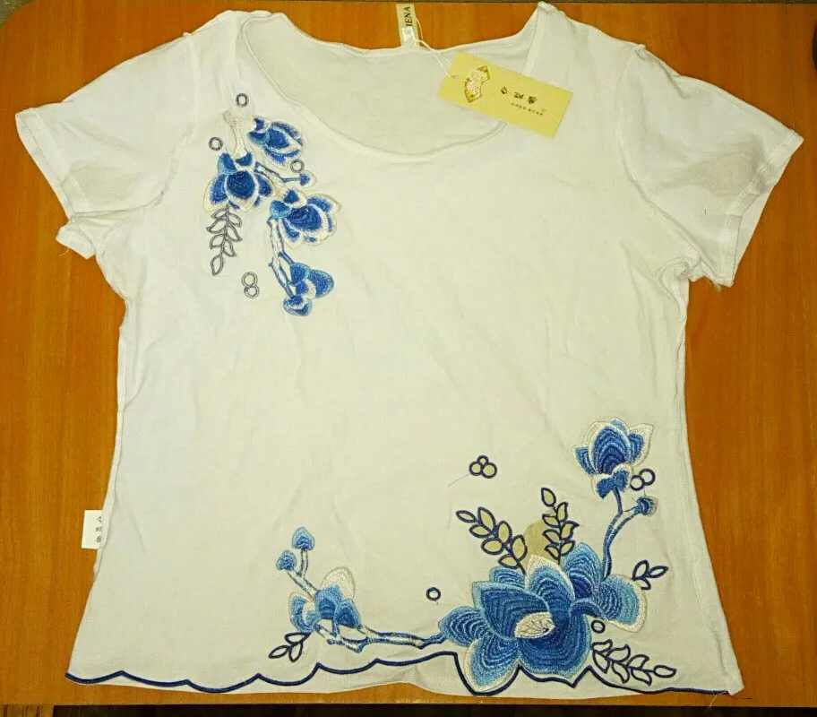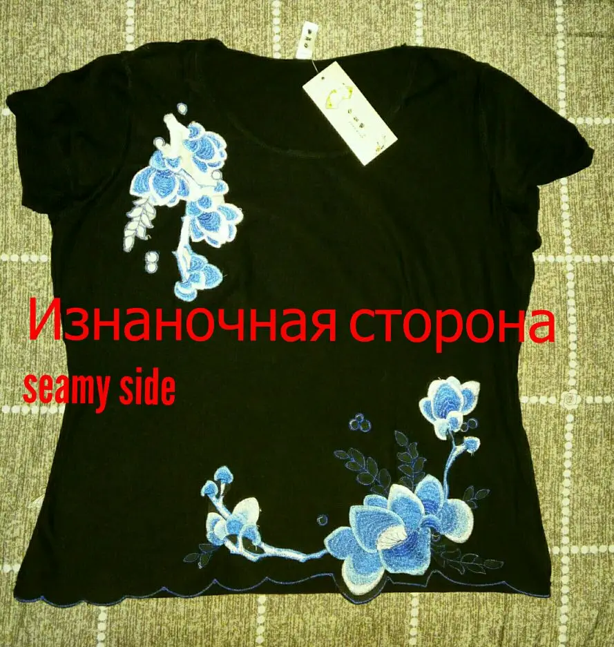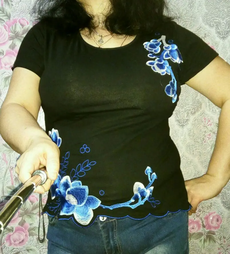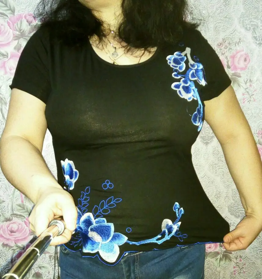 Очень понравилась футболка. Материал плотный со спандексом - ткань тянется примерно на 10 см. У меня бюст -115 см., бёдра-105 см., размер 5 XL на меня сел по груди очень в обтяжку. Я, конечно, это заранее и предполагала. Качественная вышивка, там где вышивка -ткань не тянется. У меня рост -160 см., кажется кофточка немного короткая, но это дело вкуса. Заказ полностью и подробно отслеживался. Спасибо.