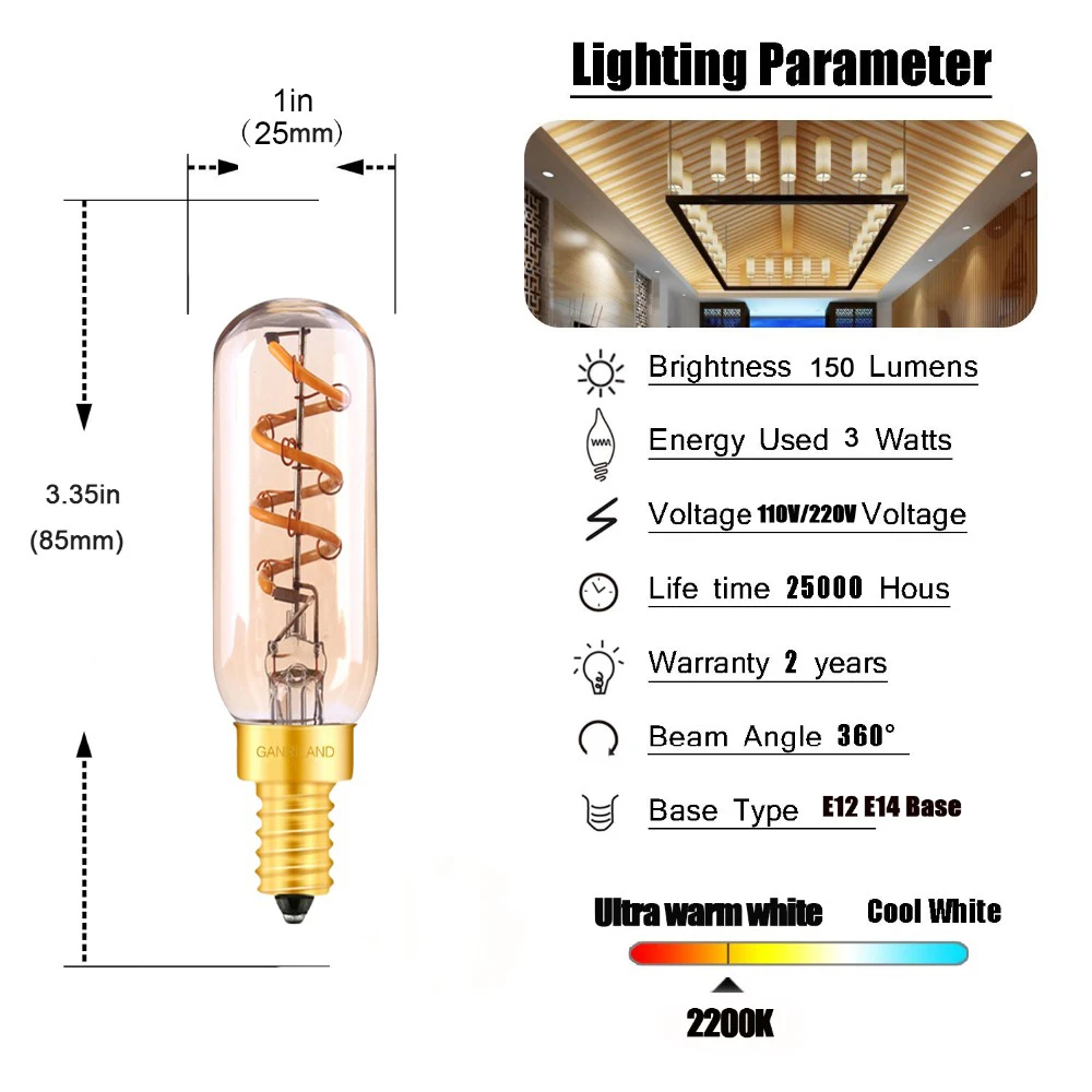 Ganriland E14 Led диммируемая Янтарная стеклянная T25T8 трубчатая Ретро лампа 3 Вт 2200 к спиральная Светодиодная лампа накаливания E12 E14 люстра освещение