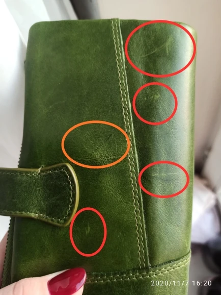 Кошелек, в целом, хороший. Было несколько царапин, но после нанесения защитного воска они пропали. Изначально имел вид мокрого изделия и неприятный запах. Пролежав два дня на балконе, вроде приобрел обычный вид, но вот запах полностью не исчез. В любом случае это не мешает, т.к. близко к носу его не подношу Вообще кошельком довольна. Красивый и вместительный. Спасибо!