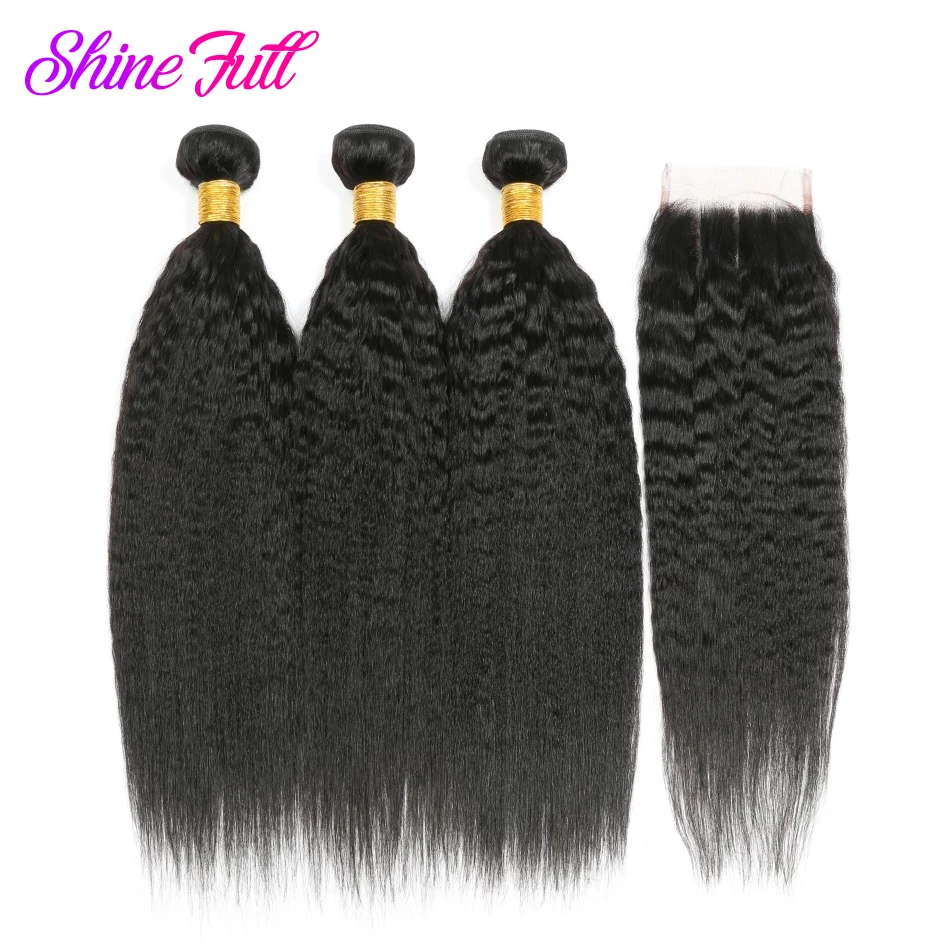 ShineFull Волосы Кудрявые прямые перуанские волосы плетение пряди с закрытием человеческие волосы 3 пряди 4*4 закрытие нет Remy грубые яки